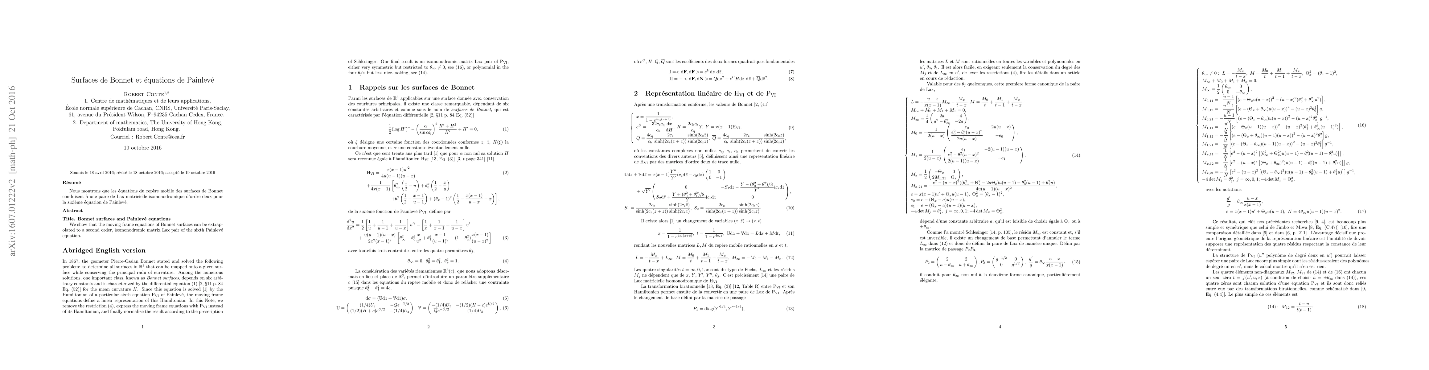 Nous montrons que les \'equations du rep\`ere mobile des surfaces de Bonnet conduisent \`a une paire de Lax matricielle isomonodromique d'ordre deux pour la sixi\`eme \'equation de Painlev\'e. We show that the moving frame equations of Bonnet surfaces can be extrapolated to a second order, isomonodromic matrix Lax pair of the sixth Painlev\'e equation.