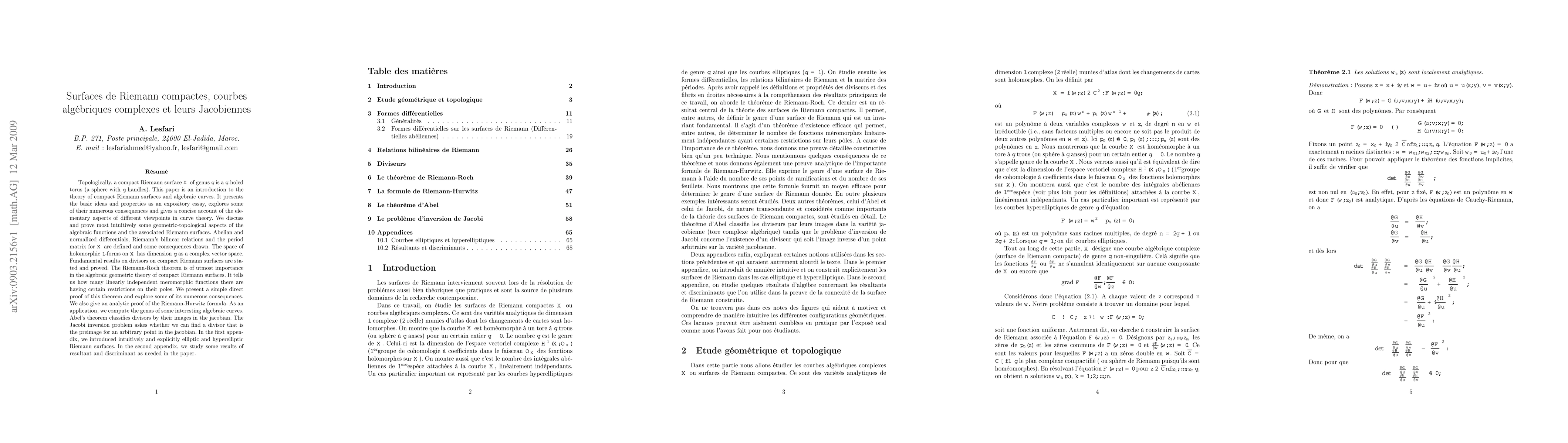 Topologically, a compact Riemann surface $X$ of genus $g$ is a $g$-holed torus (a sphere with $g$ handles). This paper is an introduction to the theory of compact Riemann surfaces and algebraic curves. It presents the basic ideas and properties as an expository essay, explores some of their numerous consequences and gives a concise account of the elementary aspects of different viewpoints in curve theory. We discuss and prove most intuitively some geometric-topological aspects of the algebraic functions and the associated Riemann surfaces. Abelian and normalized differentials, Riemann's bilinear relations and the period matrix for $X$ are defined and some consequences drawn. The space of holomorphic 1-forms on $X$ has dimension $g$ as a complex vector space. Fundamental results on divisors on compact Riemann surfaces are stated and proved. The Riemann-Roch theorem is of utmost importance in the algebraic geometric theory of compact Riemann surfaces. It tells us how many linearly independent meromorphic functions there are having certain restrictions on their poles. We present a simple direct proof of this theorem and explore some of its numerous consequences. We also give an analytic proof of the Riemann-Hurwitz formula. As an application, we compute the genus of some interesting algebraic curves. Abel's theorem classifies divisors by their images in the jacobian. The Jacobi inversion problem askes whether we can find a divisor that is the preimage for an arbitrary point in the jacobian. In the first appendix, we introduced intuitively and explicitly elliptic and hyperelliptic Riemann surfaces. In the second appendix, we study some results of resultant and discriminant as needed in the paper.