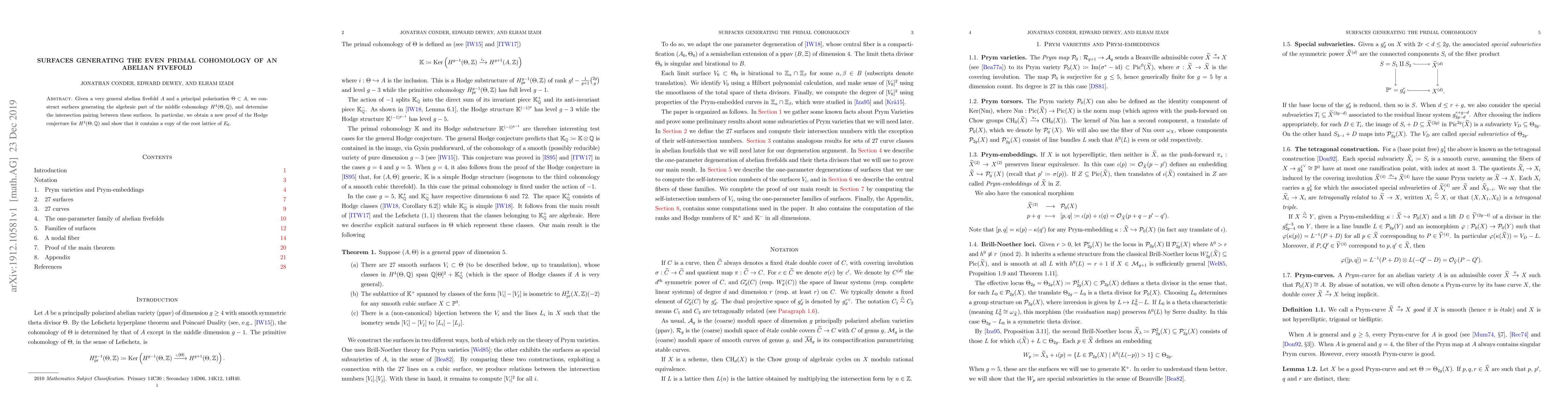 This paper constructs surfaces within a very general abelian fivefold that generate the even primal cohomology in $H^4(\Theta, \mathbb{Q})$, providing a new proof of the Hodge conjecture for this space and demonstrating it contains a copy of the $E_6$ root lattice.
