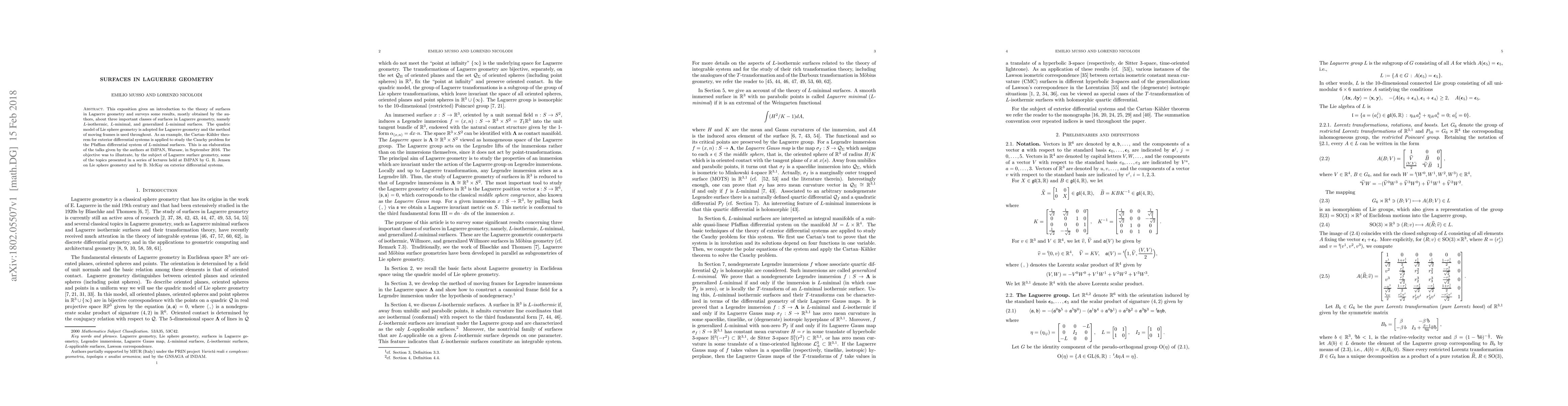 This paper introduces the theory of surfaces in Laguerre geometry, focusing on L-isothermic, L-minimal, and generalized L-minimal surfaces, using the method of moving frames and Lie sphere geometry. It applies the Cartan-Kaehler theorem to study the Cauchy problem for L-minimal surfaces.