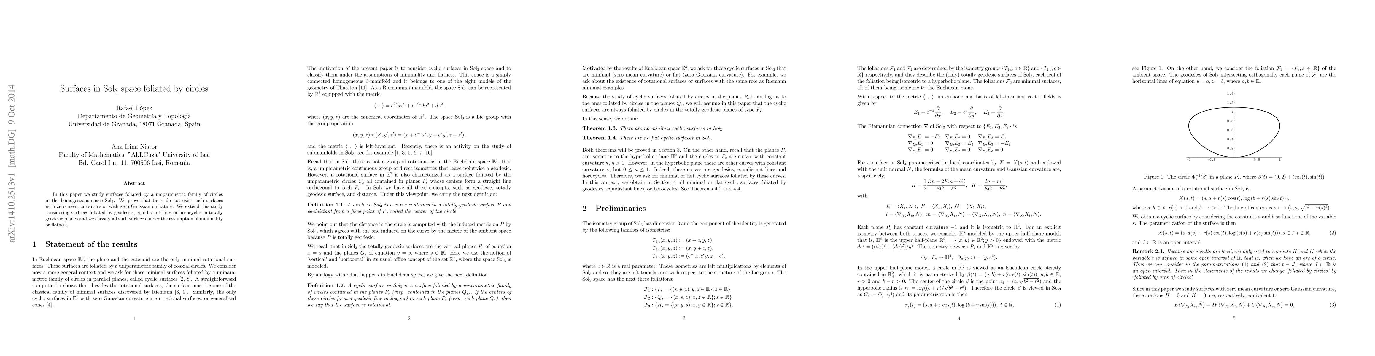 The study examines surfaces in the homogeneous space Sol3 foliated by circles, extending to geodesics, equidistant lines, and horocycles, under conditions of minimality or flatness.