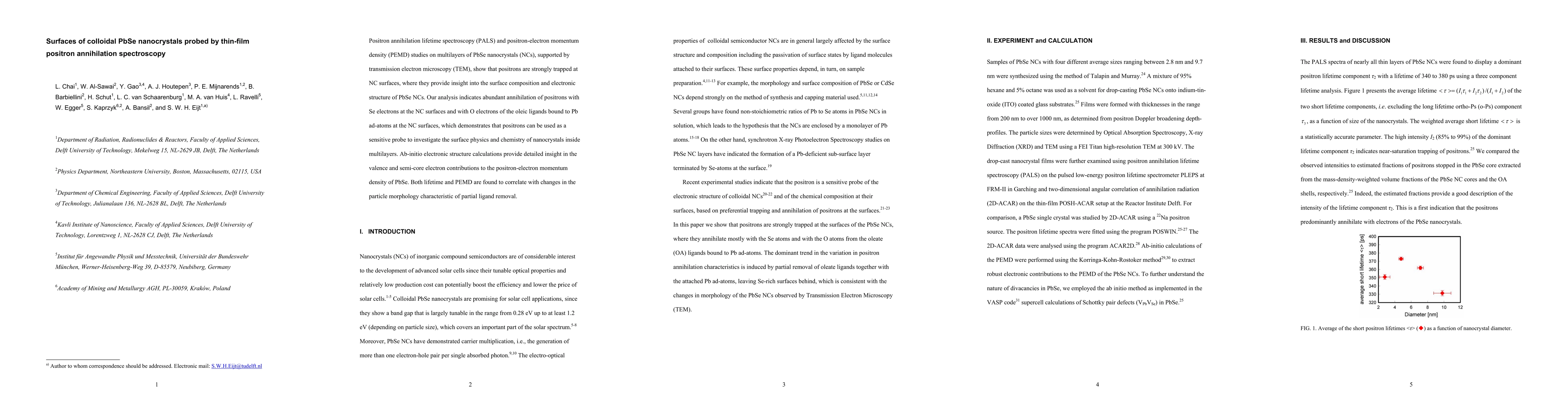 This study uses positron annihilation spectroscopy to investigate the surface composition and electronic structure of PbSe nanocrystals, revealing strong positron trapping at NC surfaces and demonstrating the technique's sensitivity in probing surface physics and chemistry. Ab-initio calculations provide insights into valence and semi-core electron contributions, correlating positron data with morphological changes due to ligand removal.