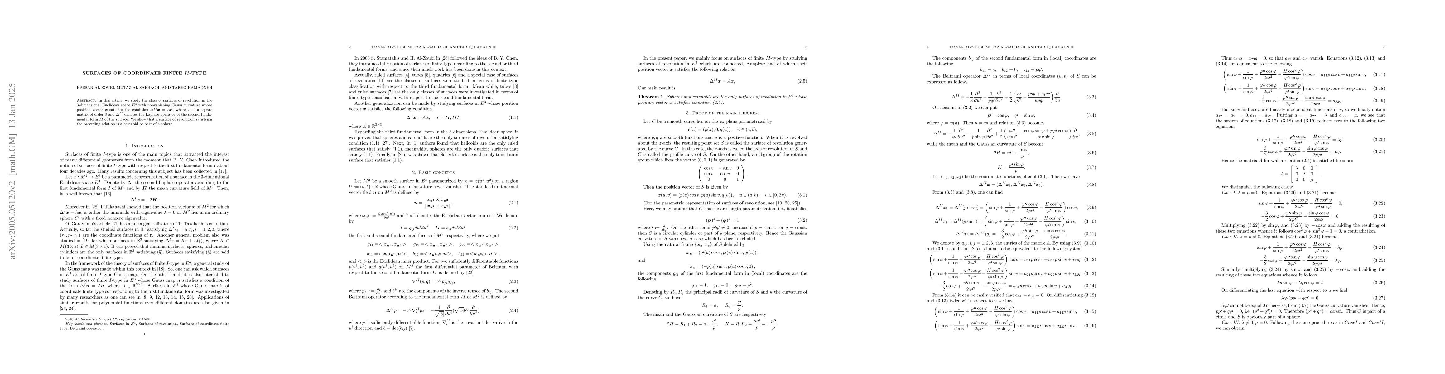 In this article, we study the class of surfaces of revolution in the 3-dimensional Euclidean space $E^{3}$ with nonvanishing Gauss curvature whose position vector $\boldsymbol{x}$ satisfies the condition $\Delta^{II}\boldsymbol{x}=A\boldsymbol{x}$, where $A$ is a square matrix of order 3 and $\Delta^{II}$ denotes the Laplace operator of the second fundamental form $II$ of the surface. We show that a surface of revolution satisfying the preceding relation is a catenoid or part of a sphere.