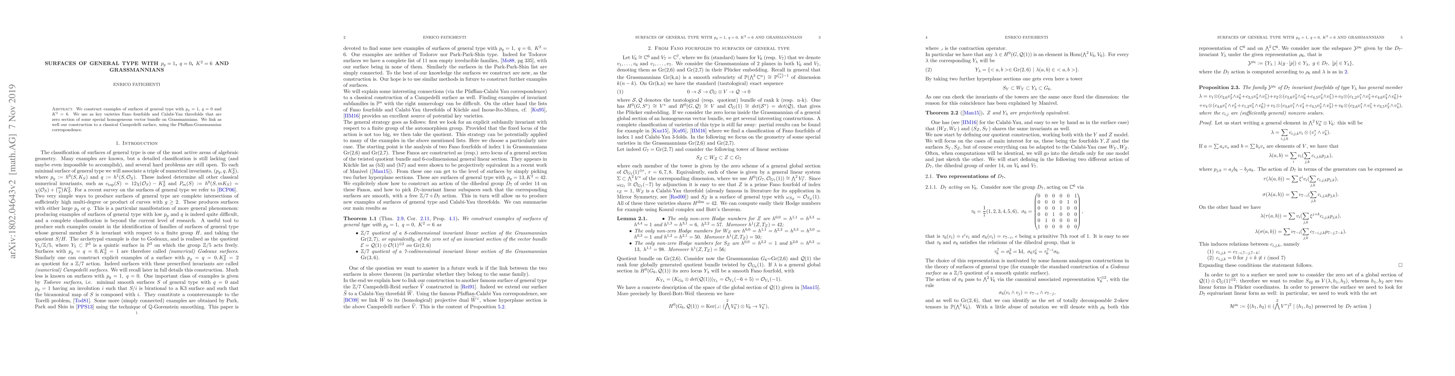 This paper constructs surfaces of general type with $p_g=1$, $q=0$, and $K^2=6$ using Fano fourfolds and Calabi-Yau threefolds as zero sections of special vector bundles on Grassmannians, and connects the construction to a classical Campedelli surface via the Pfaffian-Grassmannian correspondence.