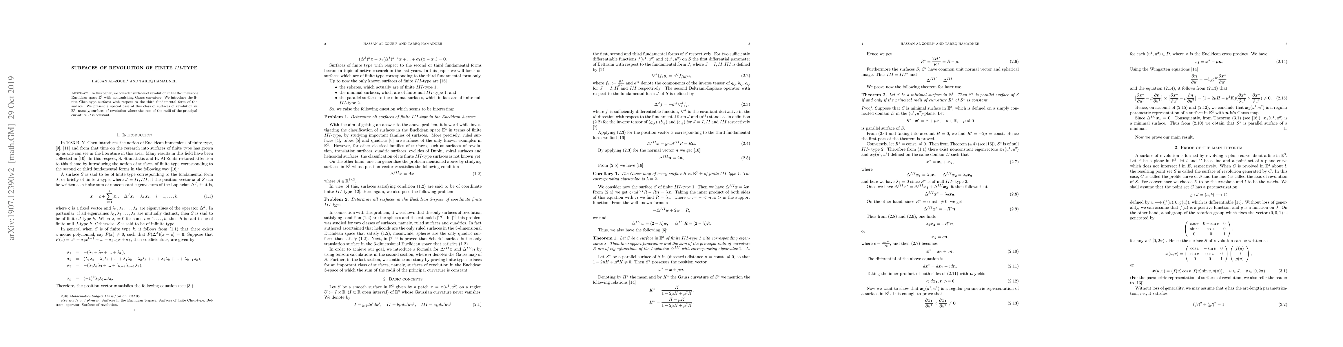 This paper investigates surfaces of revolution in 3D Euclidean space with non-zero Gauss curvature, introducing finite III-type surfaces based on the third fundamental form. It specifically examines a special case where the sum of the principal curvature radii remains constant.