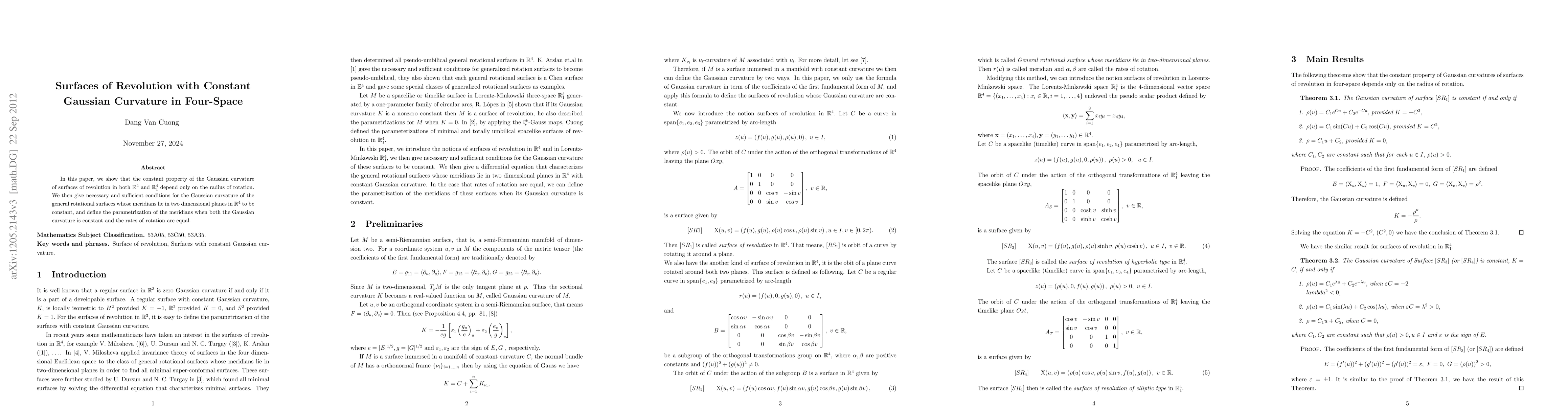 This paper demonstrates that the Gaussian curvature of surfaces of revolution in four-dimensional spaces is constant and solely depends on the radius of rotation. It provides necessary and sufficient conditions for the Gaussian curvature to be constant and defines the parametrization of the meridians under these conditions.
