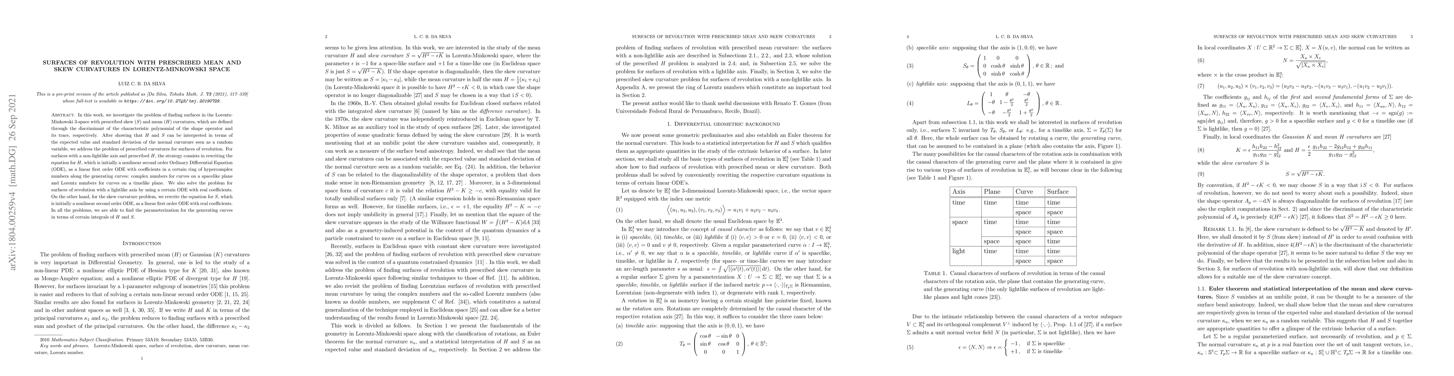 The research investigates surfaces of revolution in Lorentz-Minkowski space with prescribed mean and skew curvatures, transforming nonlinear second-order ODEs into linear first-order ODEs using hypercomplex numbers for different causal character planes.
