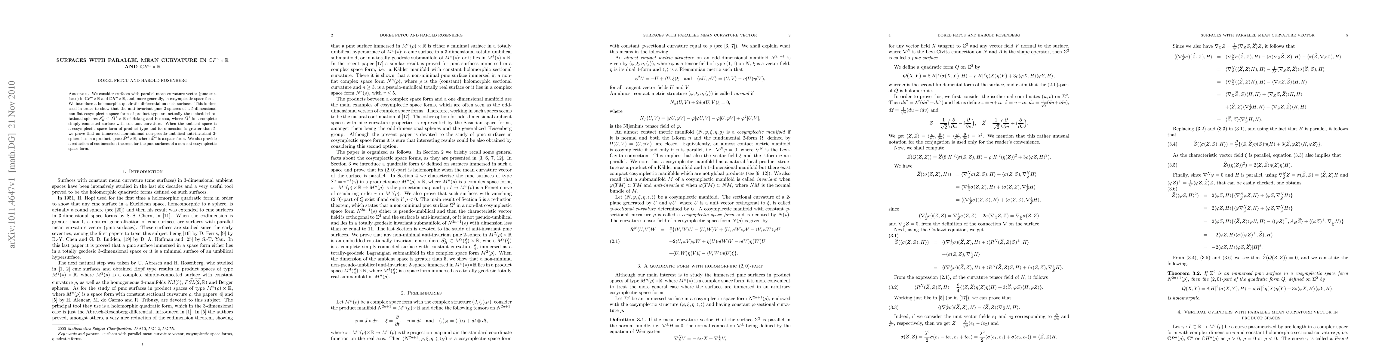 We consider surfaces with parallel mean curvature vector (pmc surfaces) in $\mathbb{C}P^n\times\mathbb{R}$ and $\mathbb{C}H^n\times\mathbb{R}$, and, more generally, in cosymplectic space forms. We introduce a holomorphic quadratic differential on such surfaces. This is then used in order to show that the anti-invariant pmc $2$-spheres of a $5$-dimensional non-flat cosymplectic space form of product type are actually the embedded rotational spheres $S_H^2\subset\bar M^2\times\mathbb{R}$ of Hsiang and Pedrosa, where $\bar M^2$ is a complete simply-connected surface with constant curvature. When the ambient space is a cosymplectic space form of product type and its dimension is greater than $5$, we prove that an immersed non-minimal non-pseudo-umbilical anti-invariant $2$-sphere lies in a product space $\bar M^4\times\mathbb{R}$, where $\bar M^4$ is a space form. We also provide a reduction of codimension theorem for the pmc surfaces of a non-flat cosymplectic space form.