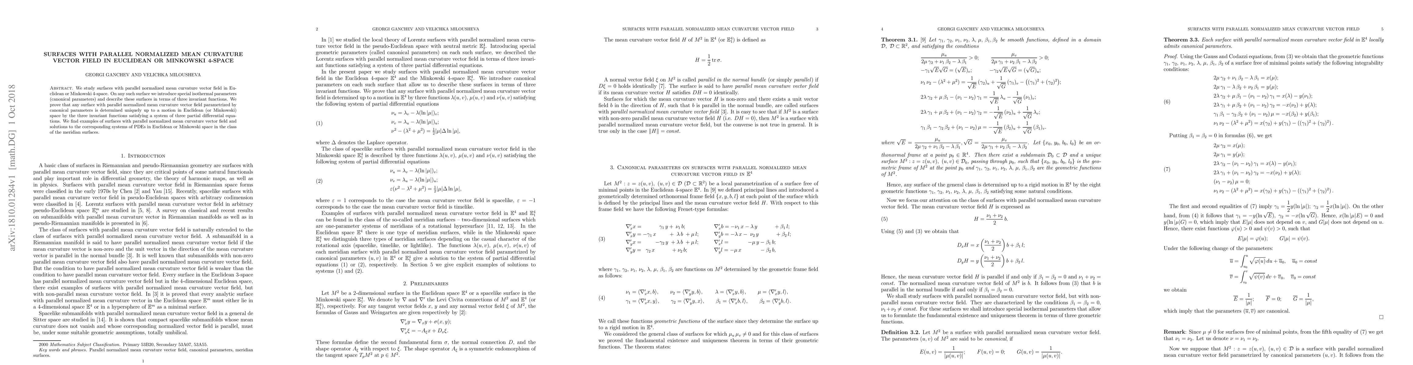 We study surfaces with parallel normalized mean curvature vector field in Euclidean or Minkowski 4-space. On any such surface we introduce special isothermal parameters (canonical parameters) and describe these surfaces in terms of three invariant functions. We prove that any surface with parallel normalized mean curvature vector field parametrized by canonical parameters is determined uniquely up to a motion in Euclidean (or Minkowski) space by the three invariant functions satisfying a system of three partial differential equations. We find examples of surfaces with parallel normalized mean curvature vector field and solutions to the corresponding systems of PDEs in Euclidean or Minkowski space in the class of the meridian surfaces.