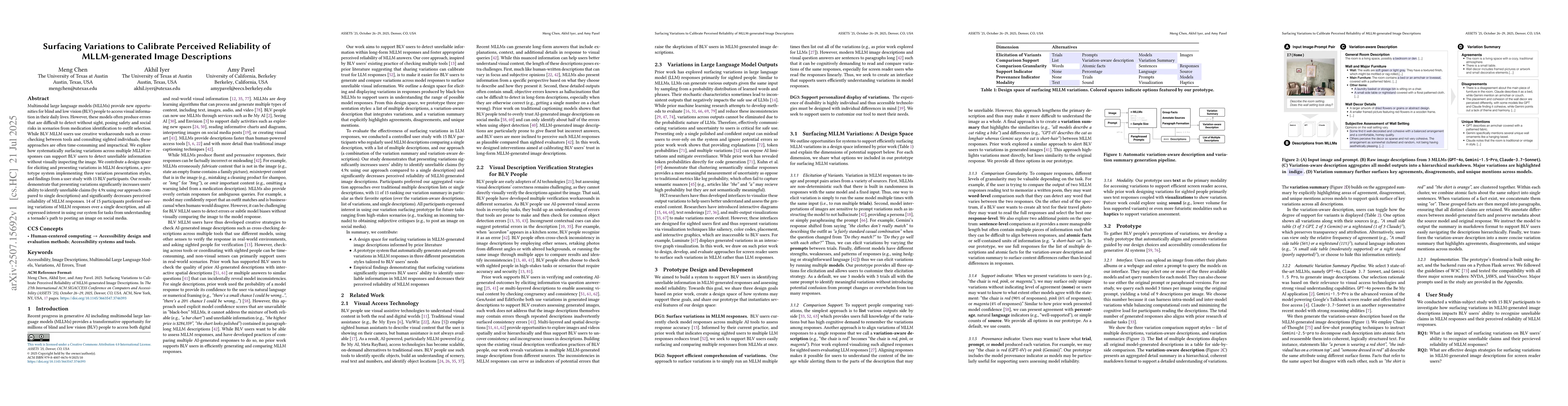 Multimodal large language models (MLLMs) provide new opportunities for blind and low vision (BLV) people to access visual information in their daily lives. However, these models often produce errors that are difficult to detect without sight, posing safety and social risks in scenarios from medication identification to outfit selection. While BLV MLLM users use creative workarounds such as cross-checking between tools and consulting sighted individuals, these approaches are often time-consuming and impractical. We explore how systematically surfacing variations across multiple MLLM responses can support BLV users to detect unreliable information without visually inspecting the image. We contribute a design space for eliciting and presenting variations in MLLM descriptions, a prototype system implementing three variation presentation styles, and findings from a user study with 15 BLV participants. Our results demonstrate that presenting variations significantly increases users' ability to identify unreliable claims (by 4.9x using our approach compared to single descriptions) and significantly decreases perceived reliability of MLLM responses. 14 of 15 participants preferred seeing variations of MLLM responses over a single description, and all expressed interest in using our system for tasks from understanding a tornado's path to posting an image on social media.