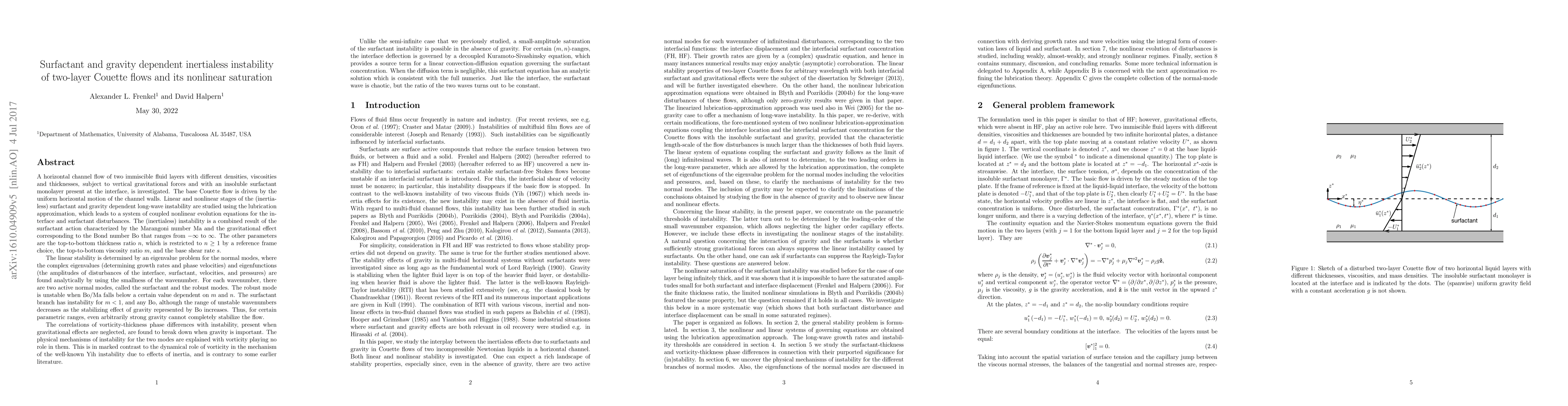 This paper investigates the instability of two-layer Couette flows with surfactants and gravity, revealing that even strong gravity cannot fully stabilize the flow under certain conditions. Nonlinear saturation of the surfactant instability occurs, governed by a Kuramoto-Sivashinsky equation for interface deflection, with chaotic but constant ratio surfactant wave behavior confirmed numerically.