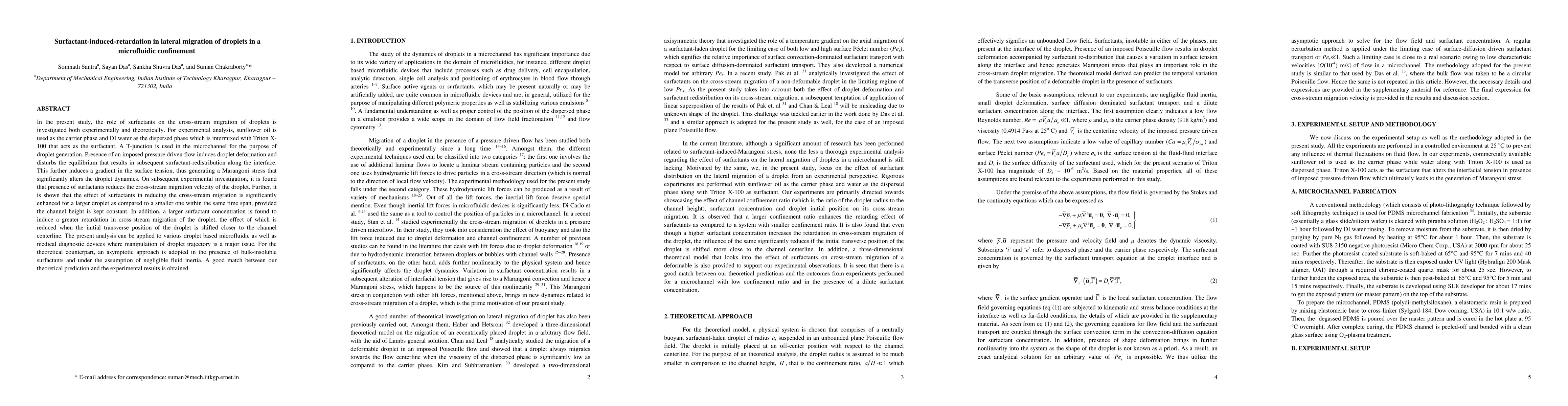 In the present study, the role of surfactants on the cross-stream migration of droplets is investigated both experimentally and theoretically. For experimental analysis, sunflower oil is used as the carrier phase and DI water as the dispersed phase which is intermixed with Triton X-100 that acts as the surfactant. A T-junction is used in the microchannel for the purpose of droplet generation. Presence of an imposed pressure driven flow induces droplet deformation and disturbs the equilibrium that results in subsequent surfactant-redistribution along the interface. This further induces a gradient in the surface tension, thus generating a Marangoni stress that significantly alters the droplet dynamics. On subsequent experimental investigation, it is found that presence of surfactants reduces the cross-stream migration velocity of the droplet. Further, it is shown that the effect of surfactants in reducing the cross-stream migration is significantly enhanced for a larger droplet as compared to a smaller one within the same time span, provided the channel height is kept constant. In addition, a larger surfactant concentration is found to induce a greater retardation in cross-stream migration of the droplet, the effect of which is reduced when the initial transverse position of the droplet is shifted closer to the channel centerline. The present analysis can be applied to various droplet based microfluidic as well as medical diagnostic devices where manipulation of droplet trajectory is a major issue. For the theoretical counterpart, an asymptotic approach is adopted in the presence of bulk-insoluble surfactants and under the assumption of negligible fluid inertia. A good match between our theoretical prediction and the experimental results is obtained.