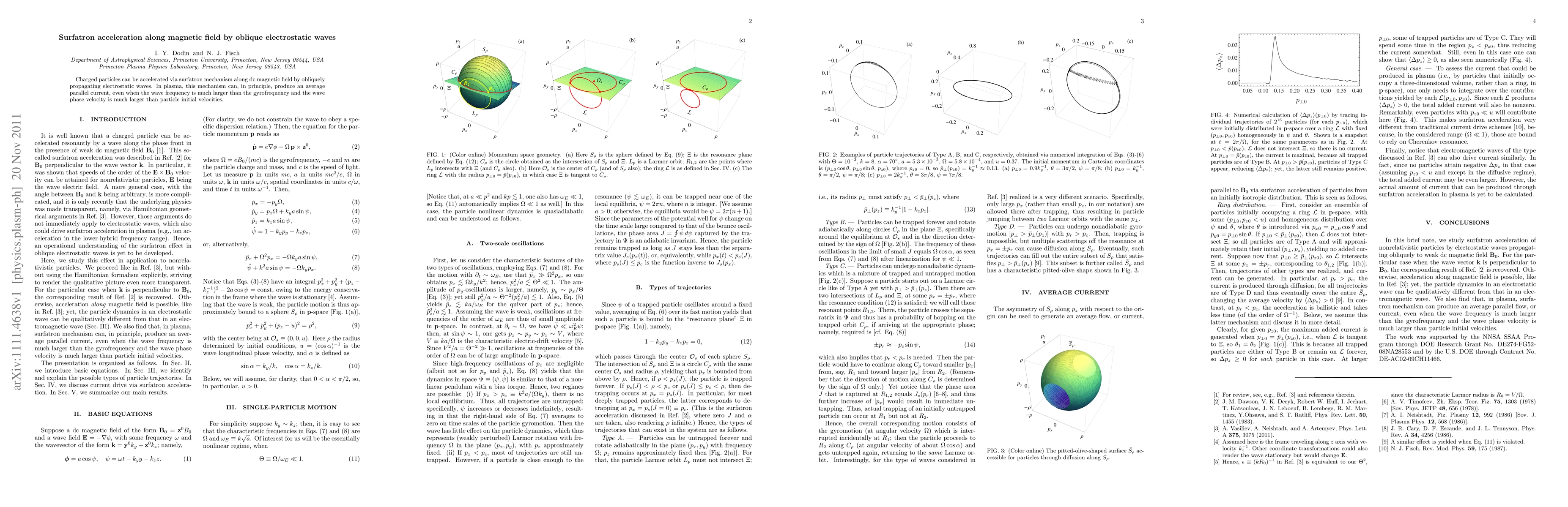 Summary: This paper explores the surfatron mechanism for accelerating charged particles along a magnetic field via oblique electrostatic waves, demonstrating its potential to generate parallel currents in plasmas even when wave frequencies exceed gyrofrequencies and phase velocities surpass initial particle velocities.