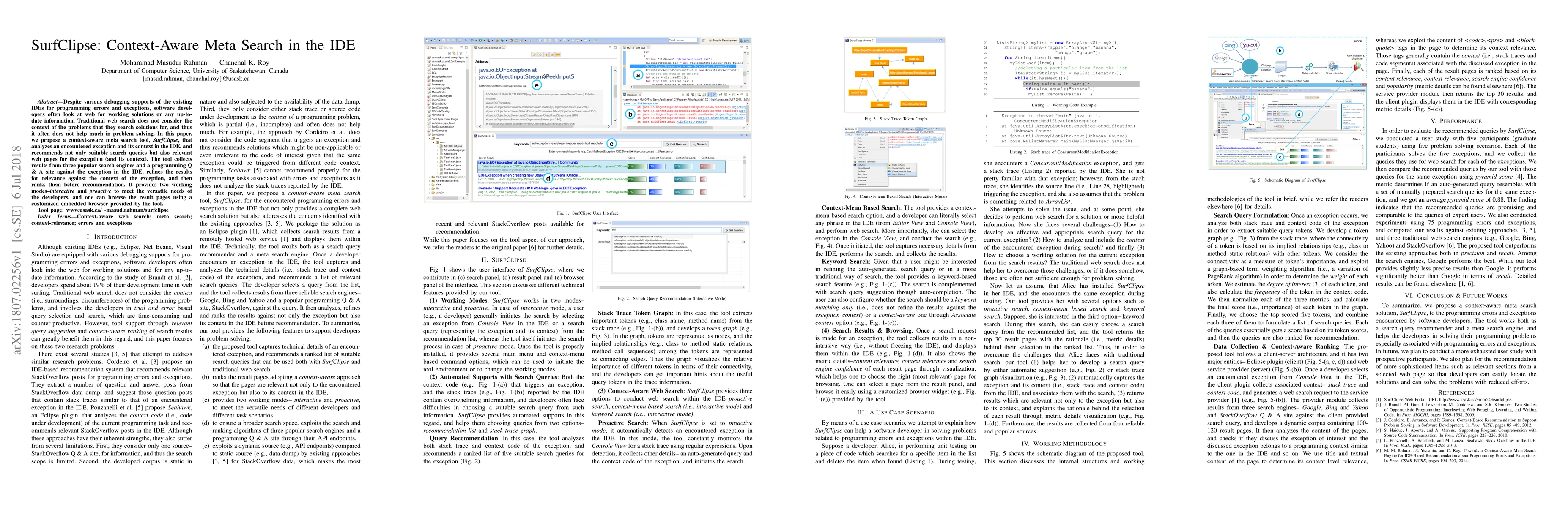 SurfClipse is a context-aware meta search tool designed to assist software developers by analyzing exceptions and their context in the IDE, recommending relevant web pages and search queries. It aggregates and refines results from multiple sources to provide tailored solutions.