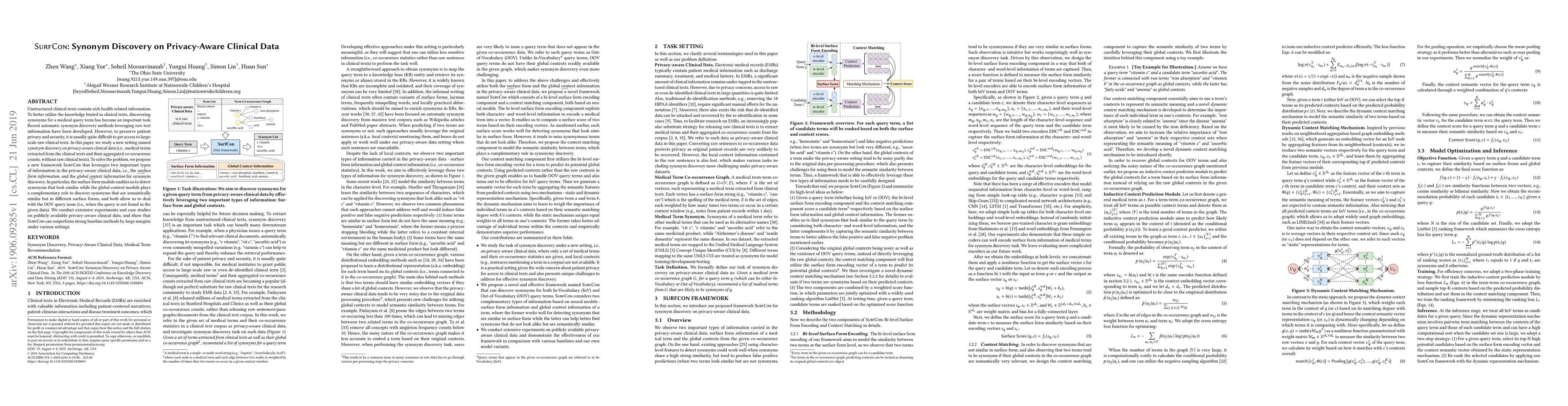 The paper presents SurfCon, a framework for discovering synonyms in privacy-aware clinical data, leveraging surface form and global context information. SurfCon outperforms existing methods by effectively handling out-of-vocabulary queries and preserving patient privacy.