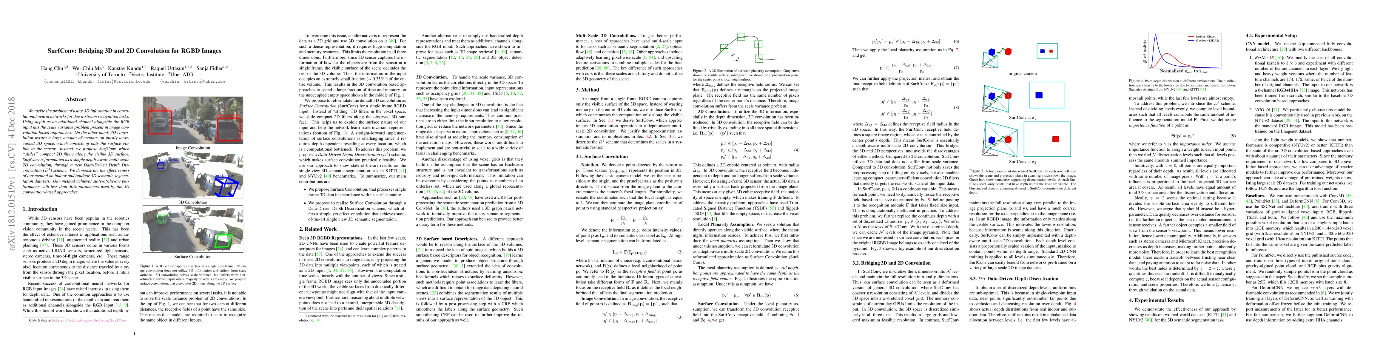 SurfConv proposes a novel depth-aware 2D convolution method that slides filters along visible 3D surfaces to efficiently utilize 3D information in RGBD images, achieving state-of-the-art performance with significantly fewer parameters compared to 3D convolution.