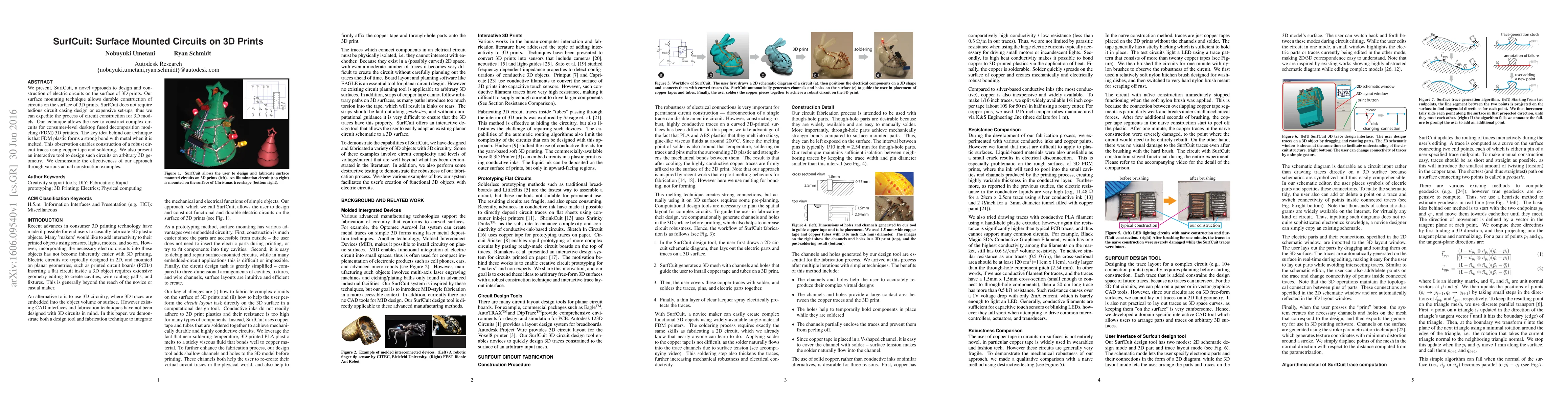 We present, SurfCuit, a novel approach to design and construction of electric circuits on the surface of 3D prints. Our surface mounting technique allows durable construction of circuits on the surface of 3D prints. SurfCuit does not require tedious circuit casing design or expensive set-ups, thus we can expedite the process of circuit construction for 3D models. Our technique allows the user to construct complex circuits for consumer-level desktop fused decomposition modeling (FDM) 3D printers. The key idea behind our technique is that FDM plastic forms a strong bond with metal when it is melted. This observation enables construction of a robust circuit traces using copper tape and soldering. We also present an interactive tool to design such circuits on arbitrary 3D geometry. We demonstrate the effectiveness of our approach through various actual construction examples.