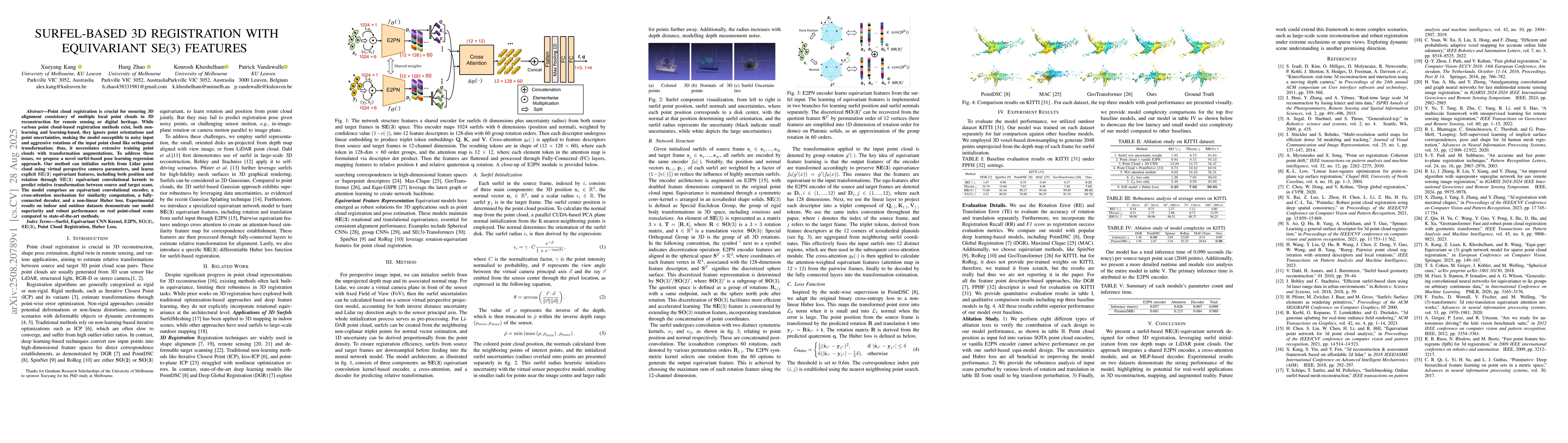 Point cloud registration is crucial for ensuring 3D alignment consistency of multiple local point clouds in 3D reconstruction for remote sensing or digital heritage. While various point cloud-based registration methods exist, both non-learning and learning-based, they ignore point orientations and point uncertainties, making the model susceptible to noisy input and aggressive rotations of the input point cloud like orthogonal transformation; thus, it necessitates extensive training point clouds with transformation augmentations. To address these issues, we propose a novel surfel-based pose learning regression approach. Our method can initialize surfels from Lidar point cloud using virtual perspective camera parameters, and learns explicit $\mathbf{SE(3)}$ equivariant features, including both position and rotation through $\mathbf{SE(3)}$ equivariant convolutional kernels to predict relative transformation between source and target scans. The model comprises an equivariant convolutional encoder, a cross-attention mechanism for similarity computation, a fully-connected decoder, and a non-linear Huber loss. Experimental results on indoor and outdoor datasets demonstrate our model superiority and robust performance on real point-cloud scans compared to state-of-the-art methods.