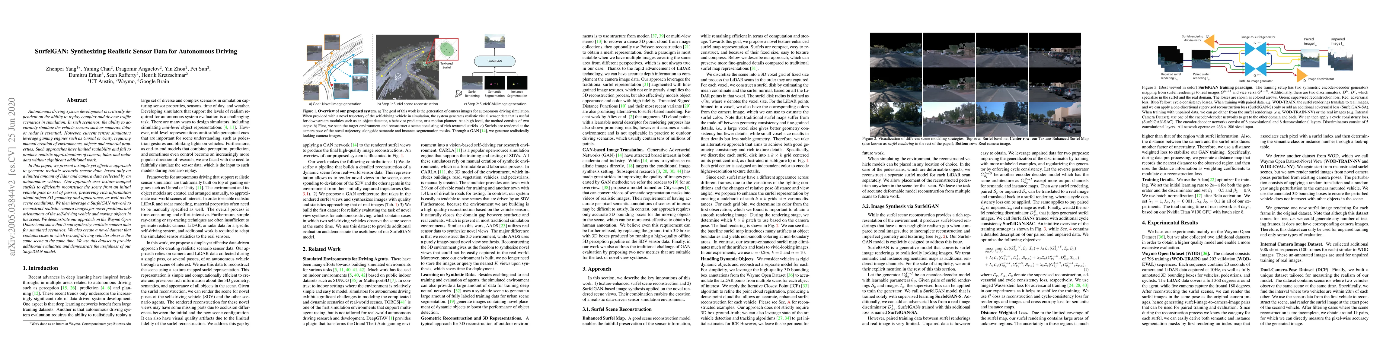 Researchers introduced SurfelGAN, a method to generate realistic sensor data for autonomous driving using lidar and camera data, enabling more diverse and accurate simulation scenarios.