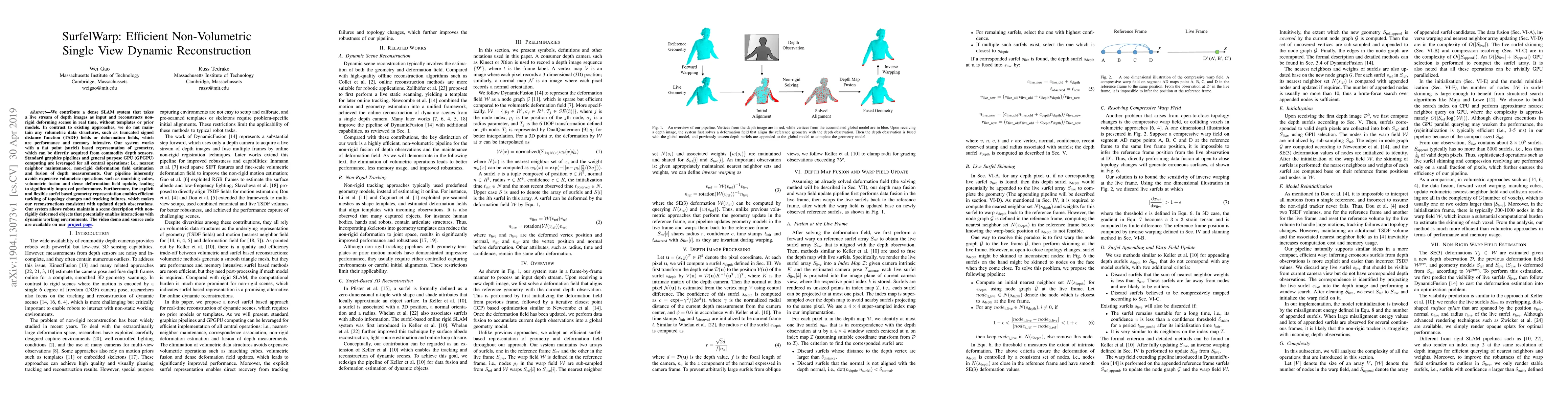SurfelWarp presents a real-time dense SLAM system for non-rigid dynamic scene reconstruction using depth images without volumetric data structures, leveraging surfel-based geometry and GPU computing for efficient performance and consistent updates.