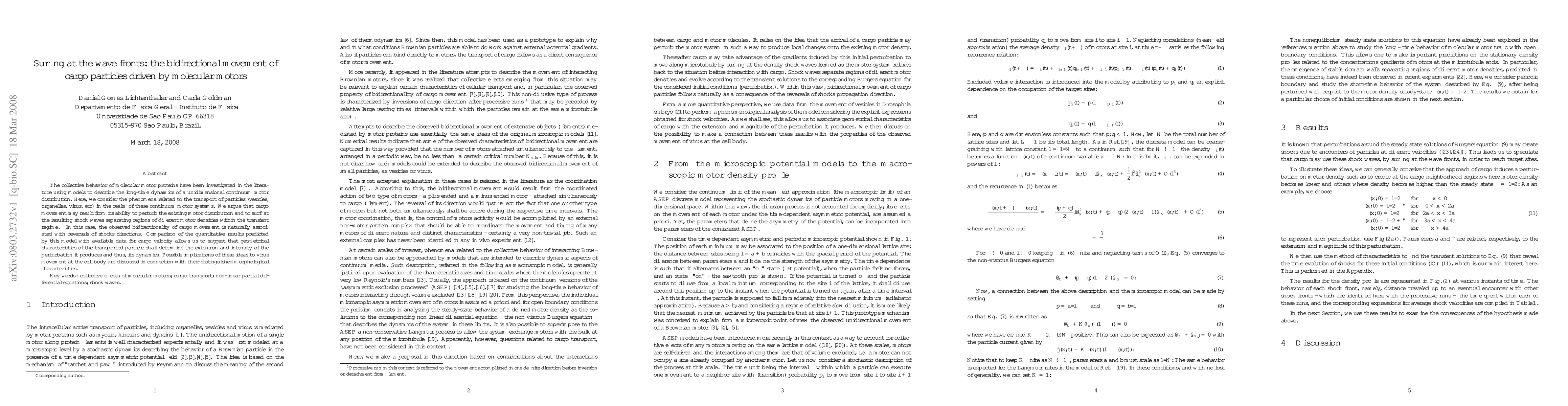 The collective behavior of molecular motor proteins have been investigated in the literature using models to describe the long-time dynamics of a unidimensional continuum motor distribution. Here, we consider the phenomena related to the transport of particles (vesicles, organelles, virus, etc) in the realm of these continuum motor systems. We argue that cargo movement may result from its ability to perturb the existing motor distribution and to surf at the resulting shock waves separating regions of different motor densities within the transient regime. In this case, the observed bidirectionality of cargo movement is naturally associated with reversals of shocks directions. Comparison of the quantitative results predicted by this model with available data for cargo velocity allows us to suggest that geometrical characteristics of the transported particle shall determine the extension and intensity of the perturbation it produces and thus, its dynamics. Possible implications of these ideas to virus movement at the cell body are discussed in connection with their distinguished morphological characteristics. Key words: collective effects of molecular motors; cargo transport; non-linear partial differential equations; shock waves.