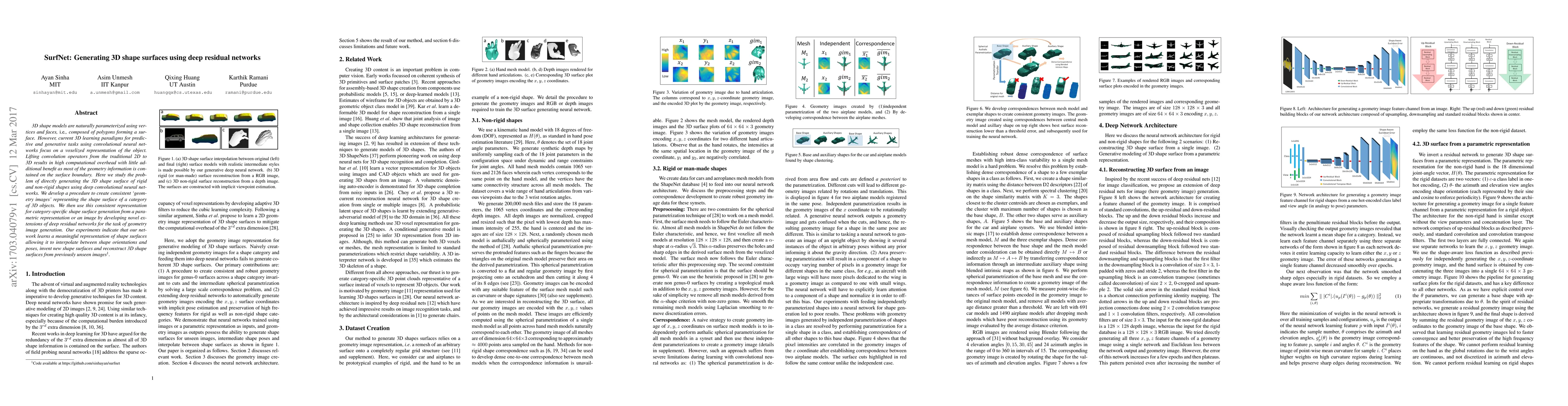 This paper introduces SurfNet, a deep residual network designed to generate 3D shape surfaces directly from geometry images, rather than voxel representations. The method produces consistent geometry images for shape surface generation, enabling interpolation, invention, and reconstruction of 3D shapes from novel inputs.