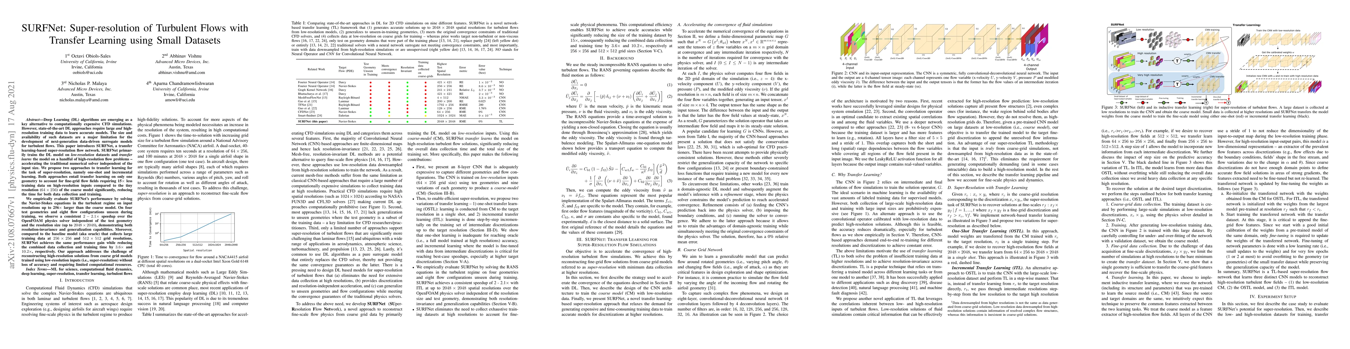 SURFNet leverages transfer learning to super-resolve turbulent flow simulations using small datasets, achieving a 2-2.1x speedup over traditional solvers without loss of accuracy. The method effectively reduces training data requirements by 15x, demonstrating resolution-invariance and generalization across various geometries.