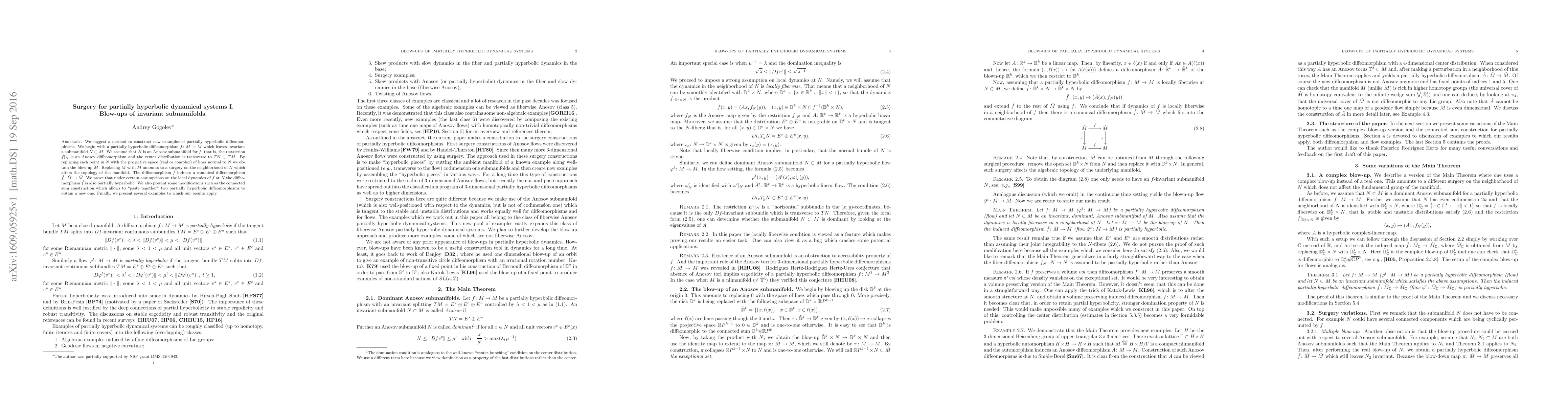 We suggest a method to construct new examples of partially hyperbolic diffeomorphisms. We begin with a partially hyperbolic diffeomorphism $f\colon M\to M$ which leaves invariant a submanifold $N\subset M$. We assume that $N$ is an Anosov submanifold for $f$, that is, the restriction $f|_N$ is an Anosov diffeomorphism and the center distribution is transverse to $TN\subset TM$. By replacing each point in $N$ with the projective space (real or complex) of lines normal to $N$ we obtain the blow-up $\hat M$. Replacing $M$ with $\hat M$ amounts to a surgery on the neighborhood of $N$ which alters the topology of the manifold. The diffeomorphism $f$ induces a canonical diffeomorphism $\hat f\colon \hat M\to \hat M$. We prove that under certain assumptions on the local dynamics of $f$ at $N$ the diffeomorphism $\hat f$ is also partially hyperbolic. We also present some modifications such as the connected sum construction which allows to "paste together" two partially hyperbolic diffeomorphisms to obtain a new one. Finally, we present several examples to which our results apply.