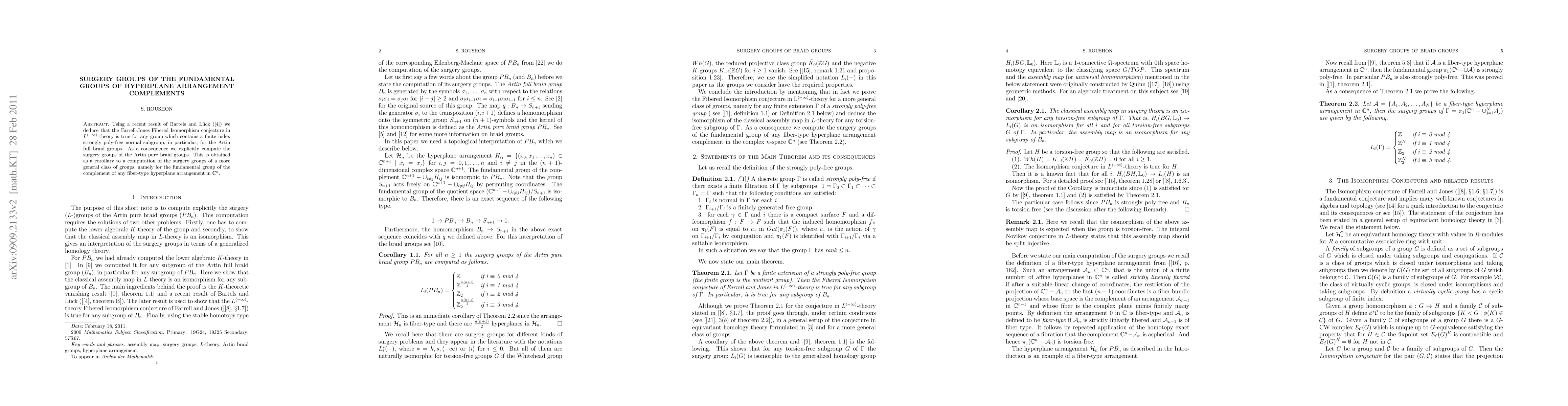 Using a recent result of Bartels and Lueck (arXiv:0901.0442) we deduce that the Farrell-Jones Fibered Isomorphism conjecture in L-theory is true for any group which contains a finite index strongly poly-free normal subgroup, in particular, for the Artin full braid groups. As a consequence we explicitly compute the surgery groups of the Artin pure braid groups. This is obtained as a corollary to a computation of the surgery groups of a more general class of groups, namely for the fundamental group of the complement of any fiber-type hyperplane arrangement in the complex n-space.