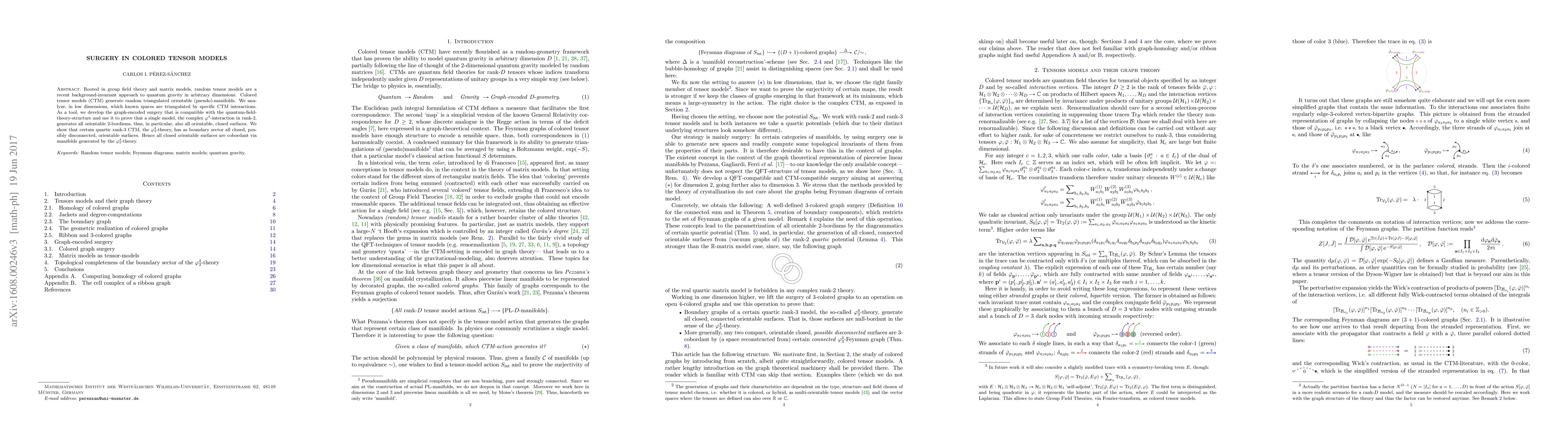 Rooted in group field theory and matrix models, random tensor models are a recent background-invariant approach to quantum gravity in arbitrary dimensions. Colored tensor models (CTM) generate random triangulated orientable (pseudo)-manifolds. We analyze, in low dimensions, which known spaces are triangulated by specific CTM interactions. As a tool, we develop the graph-encoded surgery that is compatible with the structure of quantum field theory and use it to prove that a single model, the complex $\varphi^4$-interaction in rank-$2$, generates all orientable $2$-bordisms, thus, in particular, also all orientable, closed surfaces. We show that certain quartic rank-$3$ CTM, the $\varphi_3^4$-theory, has as boundary sector all closed, possibly disconnected, orientable surfaces. Hence all closed orientable surfaces are cobordant via manifolds generated by the $\varphi_3^4$-theory.