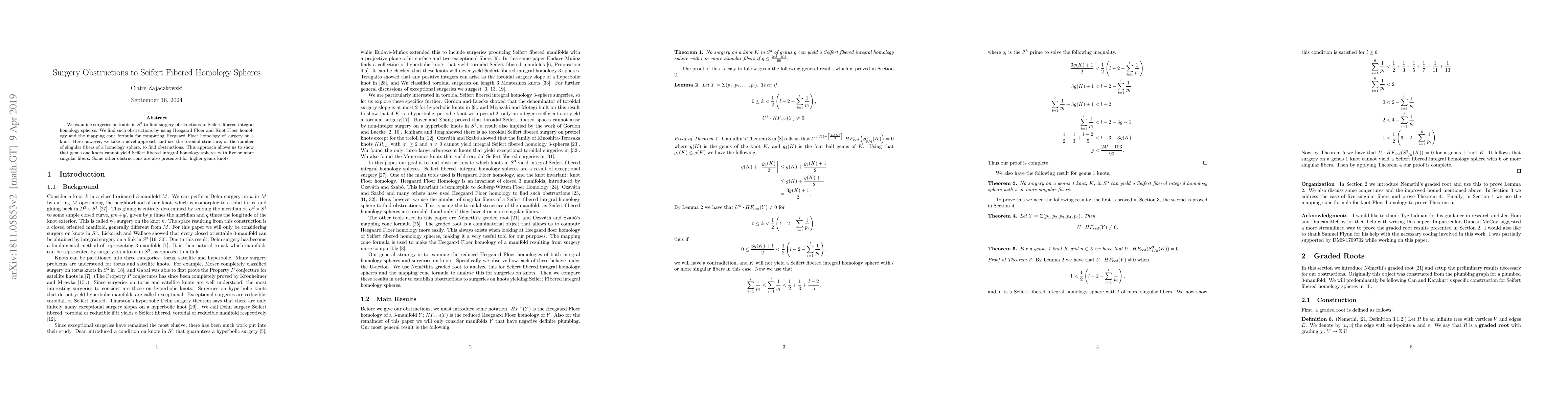 This paper investigates surgery obstructions for Seifert fibered integral homology spheres by analyzing knot surgery in $S^3$. It introduces a novel approach based on the number of singular fibers of the Seifert structure, showing that genus one knots cannot produce homology spheres with six or more singular fibers and presenting additional obstructions for higher genus knots.