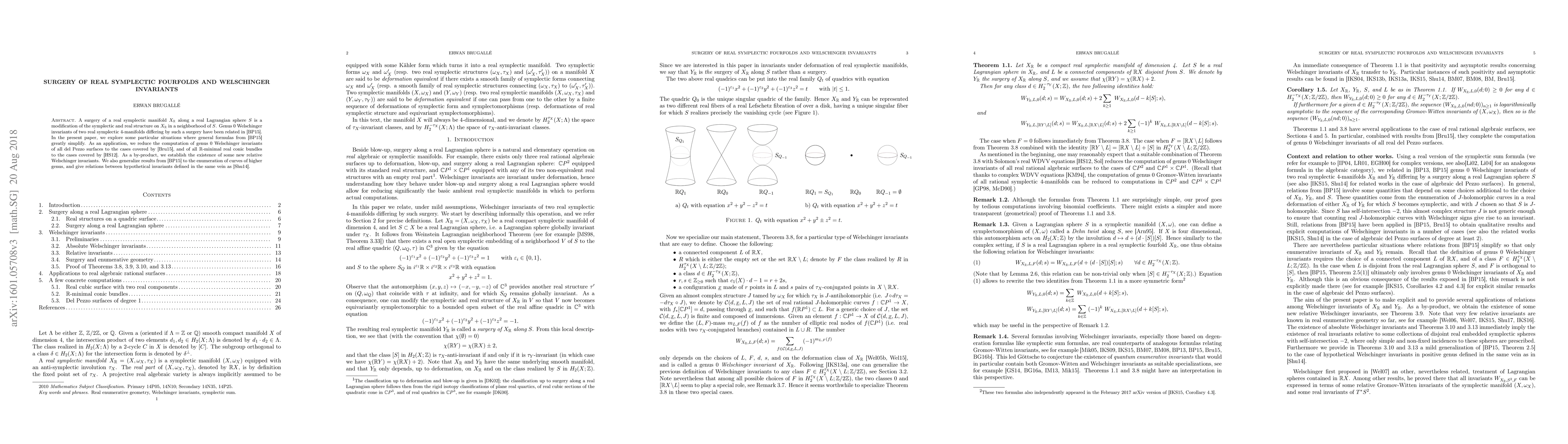 This paper studies surgeries on real symplectic fourfolds and simplifies formulas for genus 0 Welschinger invariants in specific cases, ultimately computing these invariants for del Pezzo surfaces and $\mathbb R$-minimal real conic bundles, and introducing new relative Welschinger invariants.