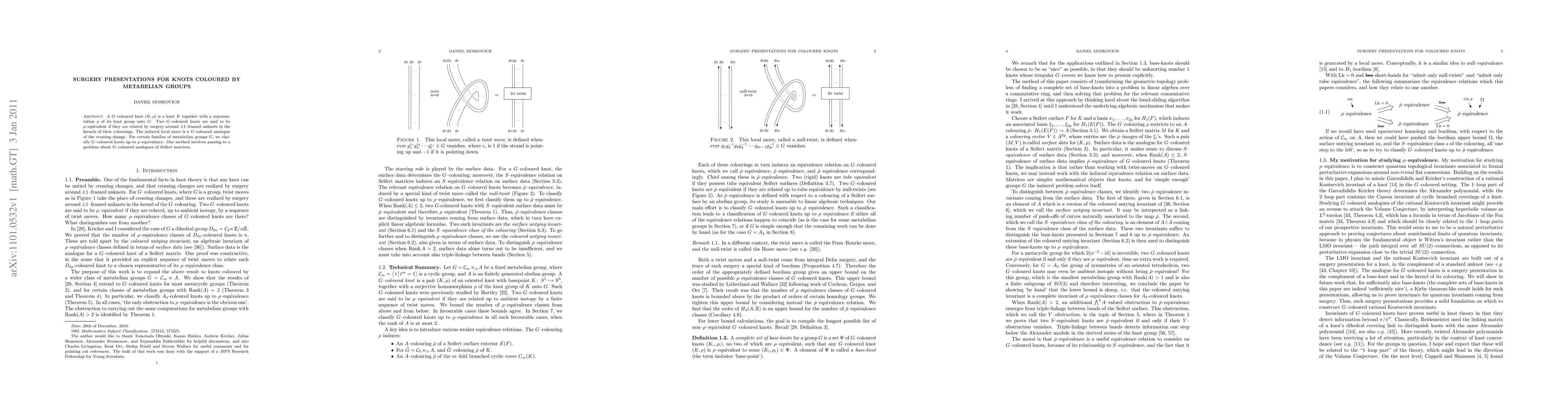 A G-coloured knot is a knot together with a representation of its knot group onto G. Two G-coloured knots are said to be rho-equivalent if they are related by surgery around unit framed unknots in the kernels of their colourings. The induced local move is a G-coloured analogue of the crossing change. For certain families of metabelian groups G, we classify G-coloured knots up to rho-equivalence. Our method involves passing to a problem about G-coloured analogues of Seifert matrices.