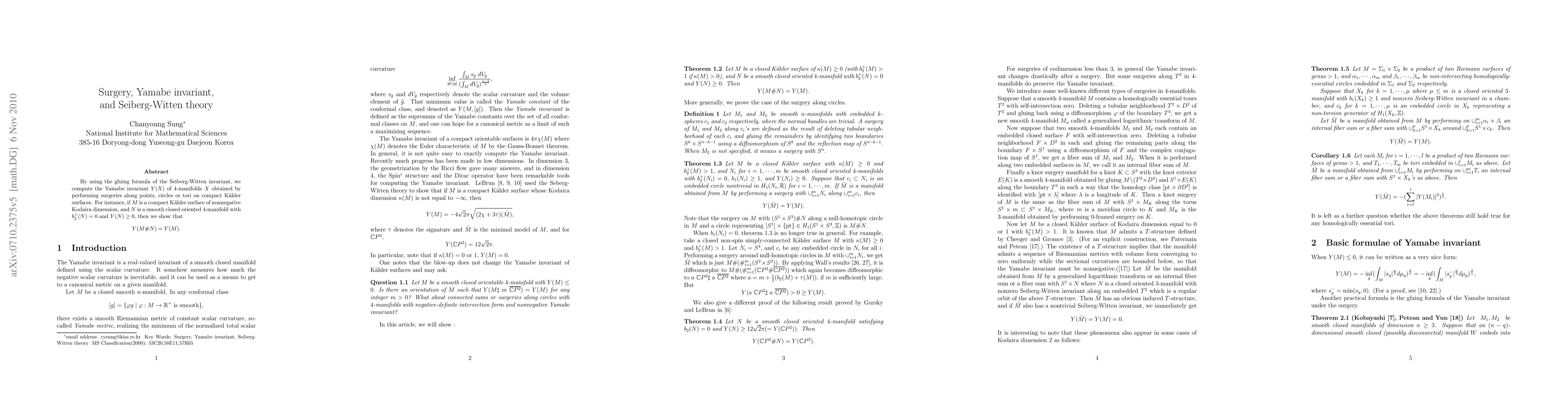 By using the gluing formula of the Seiberg-Witten invariant, we compute the Yamabe invariant Y(X) of 4-manifolds X obtained by performing surgeries along points, circles or tori on compact Kaehler surfaces. For instance, if M is a compact Kaehler surface of nonnegative Kodaira dimension, and N is a smooth closed oriented 4-manifold with b_2^+(N)=0 and Y(N)>= 0, then we show that Y(M # N)=Y(M).