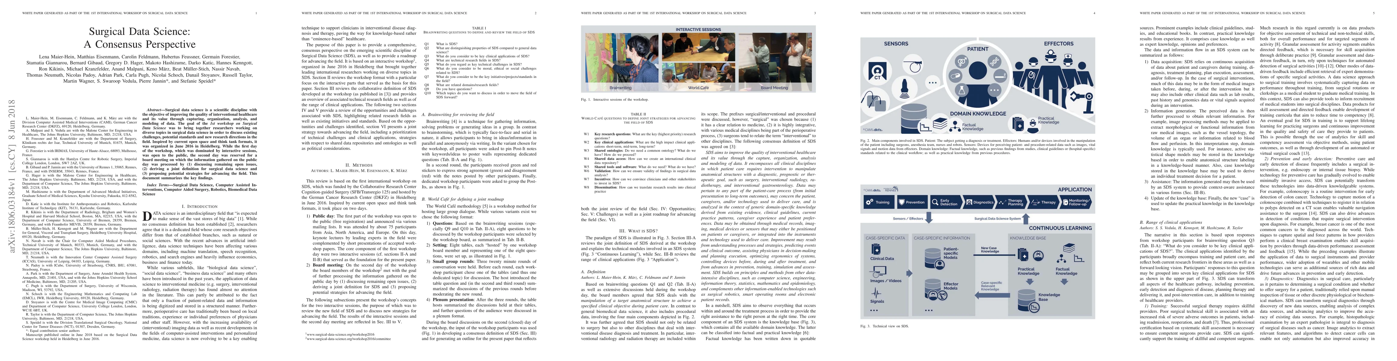 The 1st workshop on Surgical Data Science aimed to unify diverse research efforts by identifying challenges, defining standards, and proposing strategies for advancing the field. The consensus reached includes a joint definition of surgical data science and potential directions for future research.