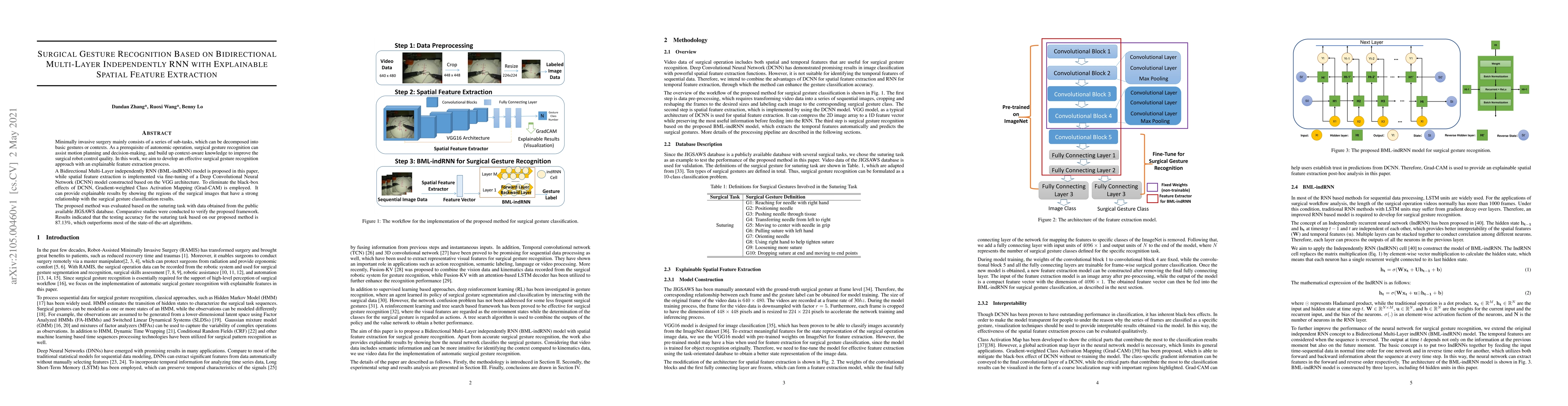 This paper proposes a Bidirectional Multi-Layer independently RNN (BML-indRNN) for surgical gesture recognition in minimally invasive surgery, combined with explainable spatial feature extraction using a fine-tuned Deep Convolutional Neural Network (DCNN) based on VGG architecture and Grad-CAM for transparency. The method achieved 87.13% accuracy on the suturing task from the JIGSAWS database, outperforming other state-of-the-art algorithms.
