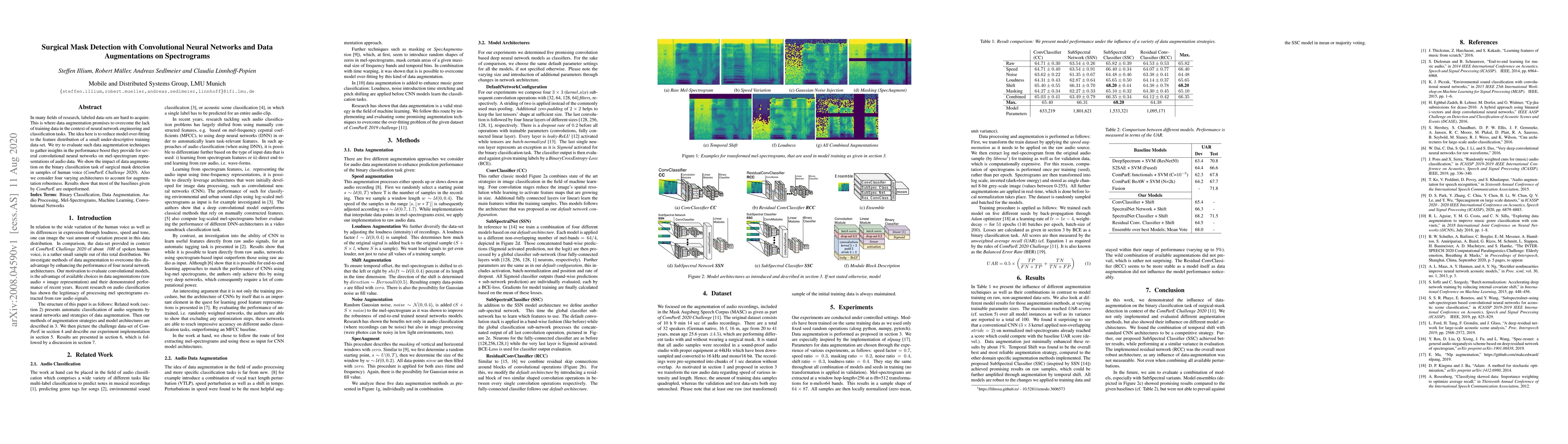 In many fields of research, labeled datasets are hard to acquire. This is where data augmentation promises to overcome the lack of training data in the context of neural network engineering and classification tasks. The idea here is to reduce model over-fitting to the feature distribution of a small under-descriptive training dataset. We try to evaluate such data augmentation techniques to gather insights in the performance boost they provide for several convolutional neural networks on mel-spectrogram representations of audio data. We show the impact of data augmentation on the binary classification task of surgical mask detection in samples of human voice (ComParE Challenge 2020). Also we consider four varying architectures to account for augmentation robustness. Results show that most of the baselines given by ComParE are outperformed.