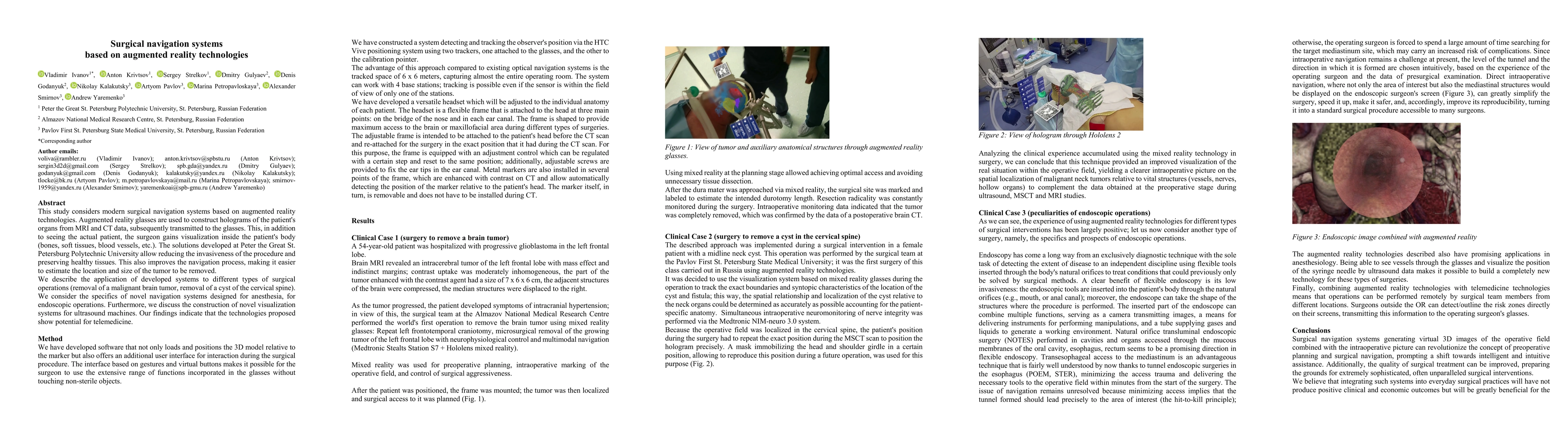 This study explores augmented reality-based surgical navigation systems that use holograms to visualize patient anatomy from MRI and CT data, enhancing surgical precision and reducing invasiveness. The developed systems at Peter the Great St. Petersburg Polytechnic University show promise in various surgeries and have potential applications in telemedicine.