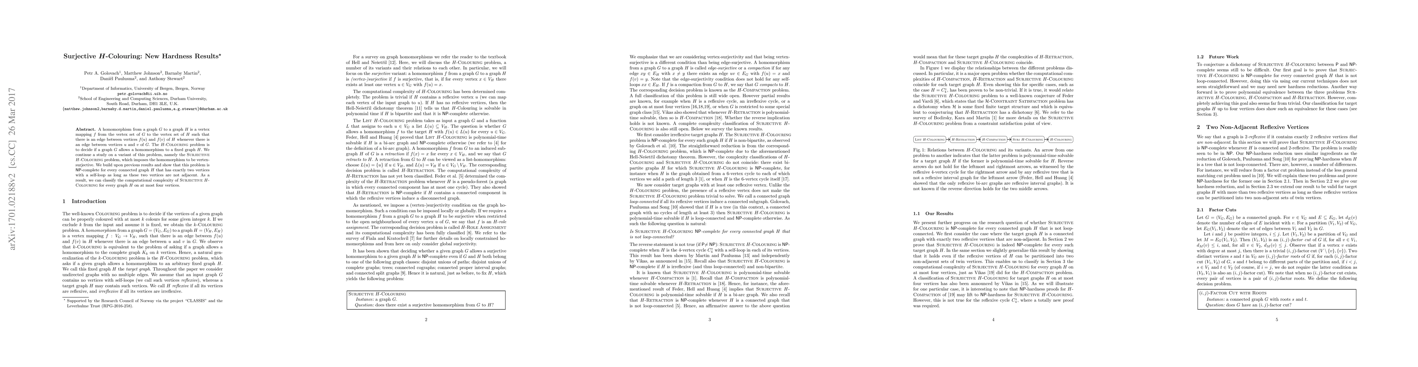 This paper investigates the Surjective H-Colouring problem, a variant of graph homomorphism where the mapping must be surjective. It establishes NP-completeness for this problem when H has exactly two non-adjacent vertices with self-loops, classifying its complexity for all graphs H with four or fewer vertices.