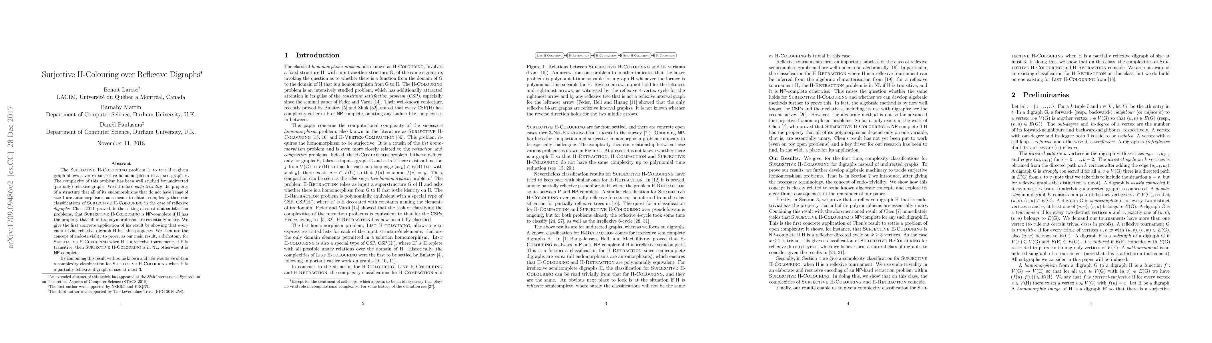 This paper explores the complexity of the Surjective H-Colouring problem for reflexive digraphs by introducing the concept of endo-triviality. It proves that Surjective H-Colouring is in NL if H is a transitive reflexive tournament, and NP-complete otherwise, providing a complexity classification for such problems when H is a partially reflexive digraph of size at most 3.
