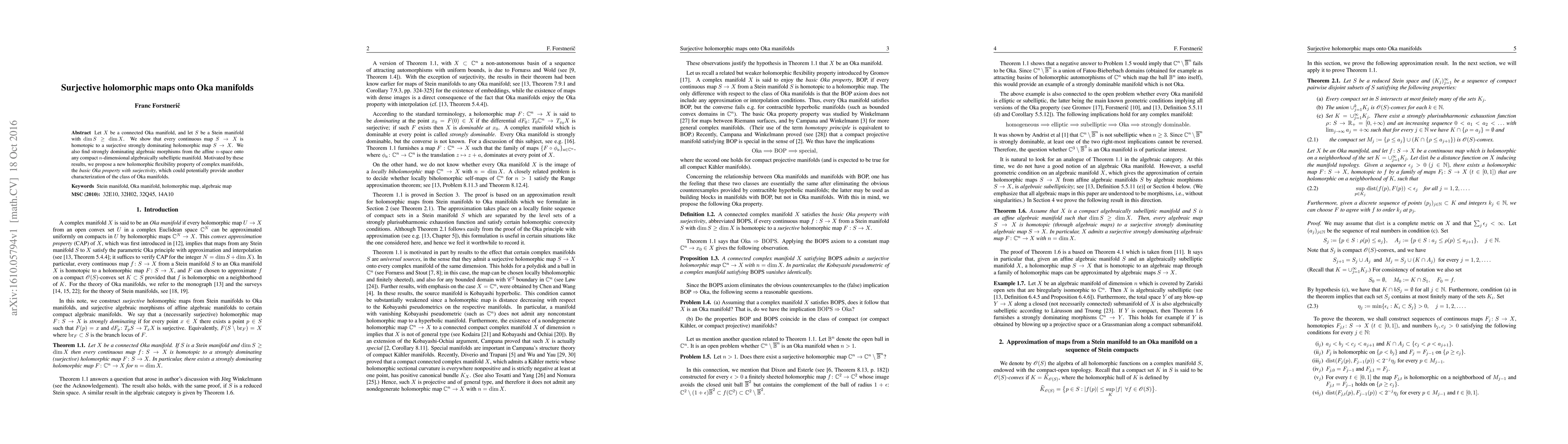 This paper demonstrates that any continuous map from a Stein manifold $S$ to a connected Oka manifold $X$ is homotopic to a surjective strongly dominating holomorphic map, and presents algebraic morphisms from affine spaces to certain compact subelliptic manifolds. It proposes the basic Oka property with surjectivity as a potential new characterization of Oka manifolds.