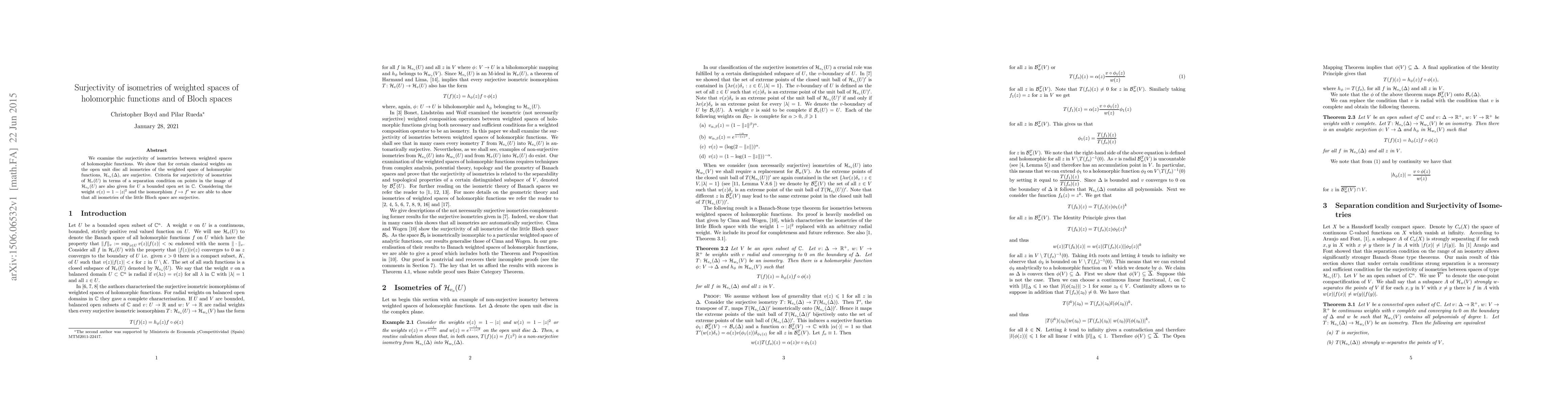 This paper investigates the surjectivity of isometries in weighted spaces of holomorphic functions, proving that certain isometries in these spaces are surjective under specific weight conditions. It also establishes criteria for surjectivity based on separation conditions and demonstrates that isometries of the little Bloch space are surjective.