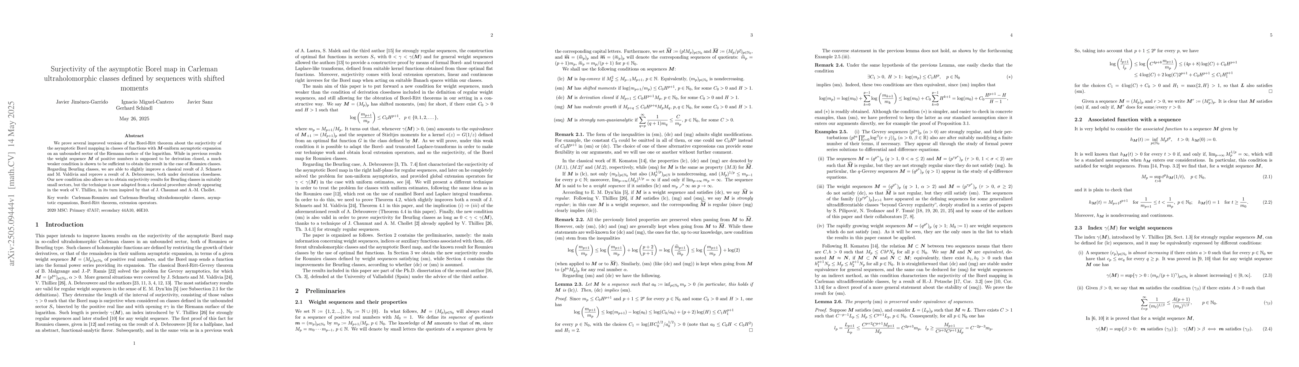 This paper improves the Borel-Ritt theorem for surjectivity of asymptotic mapping in Carleman ultraholomorphic classes with shifted moments, relaxing conditions for Roumieu and Beurling classes.
