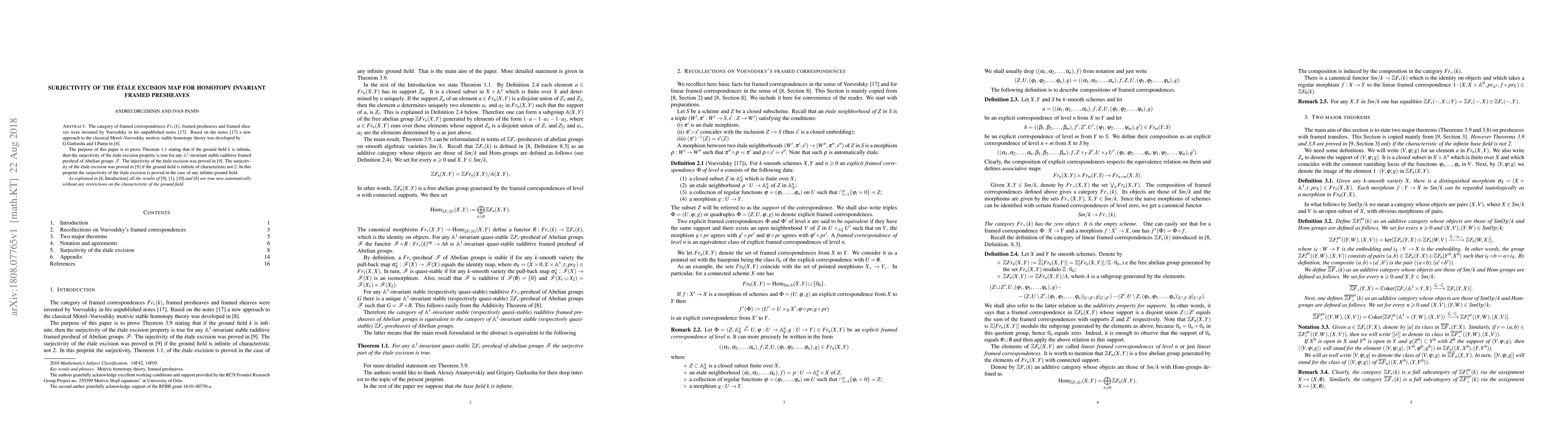The category of framed correspondences Fr_*(k), framed presheaves and framed sheaves were invented by Voevodsky in his unpublished notes [17]. Based on the notes [17] a new approach to the classical Morel--Voevodsky motivic stable homotopy theory was developed by G.Garkusha and I.Panin in [8]. The purpose of this paper is to prove Theorem 1.1 stating that if the ground field k is infinite, then the surjectivity of the etale excision property is true for any A1-invariant stable radditive framed presheaf of Abelian groups F. The injectivity of the etale excision was proved in [9]. The surjectivity of the etale excision was proved in [9] if the ground field is infinite of characteristic not 2. In this preprint the surjectivity of the etale excision is proved in the case of any infinite ground field. As explained in the introduction to [8] all the results of [9], [1], [10] and [8] are true now automatically without any restrictions on the characteristic of the ground field.