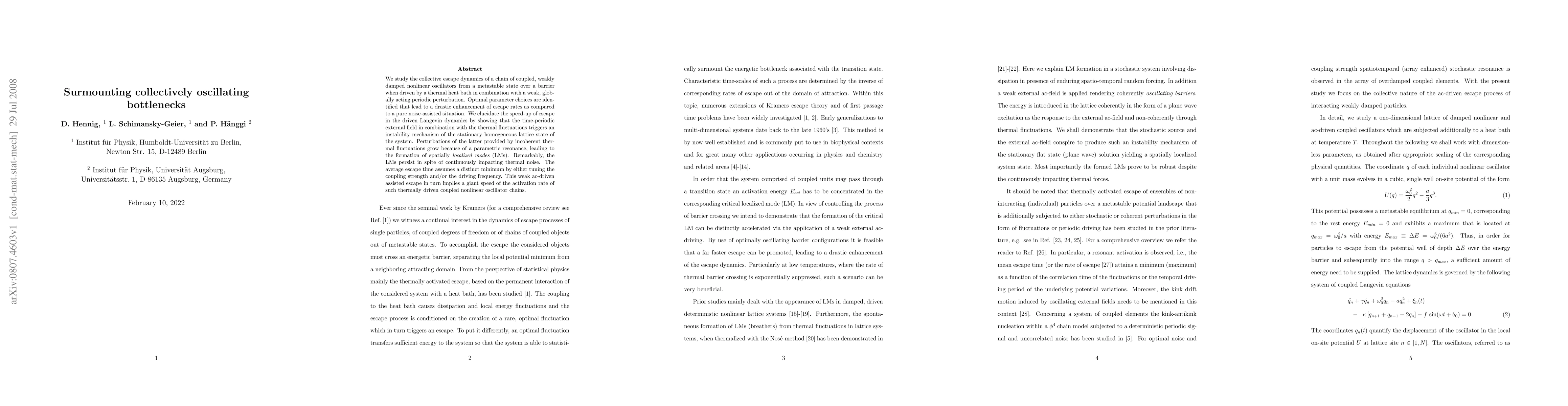 We study the collective escape dynamics of a chain of coupled, weakly damped nonlinear oscillators from a metastable state over a barrier when driven by a thermal heat bath in combination with a weak, globally acting periodic perturbation. Optimal parameter choices are identified that lead to a drastic enhancement of escape rates as compared to a pure noise-assisted situation. We elucidate the speed-up of escape in the driven Langevin dynamics by showing that the time-periodic external field in combination with the thermal fluctuations triggers an instability mechanism of the stationary homogeneous lattice state of the system. Perturbations of the latter provided by incoherent thermal fluctuations grow because of a parametric resonance, leading to the formation of spatially localized modes (LMs). Remarkably, the LMs persist in spite of continuously impacting thermal noise. The average escape time assumes a distinct minimum by either tuning the coupling strength and/or the driving frequency. This weak ac-driven assisted escape in turn implies a giant speed of the activation rate of such thermally driven coupled nonlinear oscillator chains.