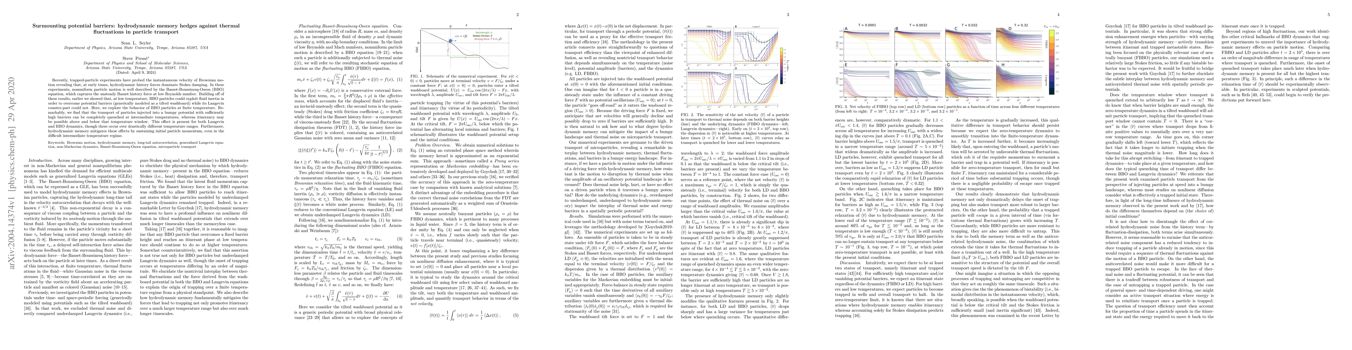 Recently, trapped-particle experiments have probed the instantaneous velocity of Brownian motion revealing that, at early times, hydrodynamic history forces dominate Stokes damping. In these experiments, nonuniform particle motion is well described by the Basset-Boussinesq-Oseen (BBO) equation, which captures the unsteady Basset history force at low Reynolds number. Building off of these results, earlier we showed that, at low temperature, BBO particles could exploit fluid inertia in order to overcome potential barriers (generically modeled as a tilted washboard) while its Langevin counter-part could not. Here, we explore the behavior of BBO particles at finite temperature. Remarkably, we find that the transport of particles injected into a bumpy potential with sufficiently high barriers can be completely quenched at intermediate temperatures, whereas itinerancy may be possible above and below that temperature window. This effect is present for both Langevin and BBO dynamics, though these occur over drastically different temperature ranges. Furthermore, hydrodynamic memory mitigates these effects by sustaining initial particle momentum, even in the difficult intermediate temperature regime.