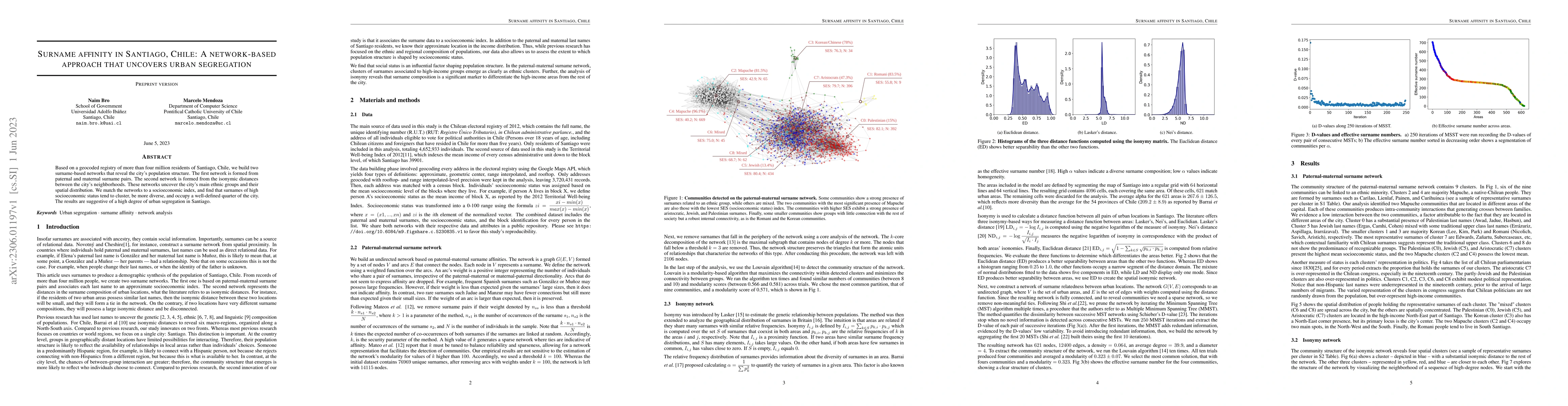 The paper introduces a network-based approach to analyze surname affinity and its association with socioeconomic status, uncovering urban segregation patterns in Santiago, Chile.