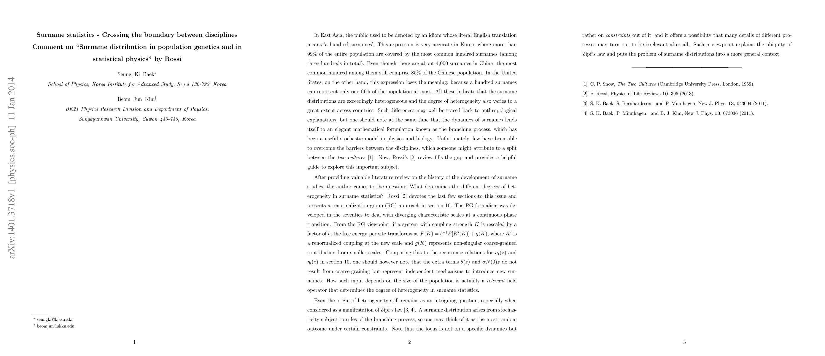 Regarding "Surname distribution in population genetics and in statistical physics" by Rossi, we add comments on the following two points: One is a difference in his renormalization-group formulation from the traditional one in statistical physics despite apparent similarity. The other is the potential importance of the entropy maximization principle under constraints governing the evolution of surname statistics.