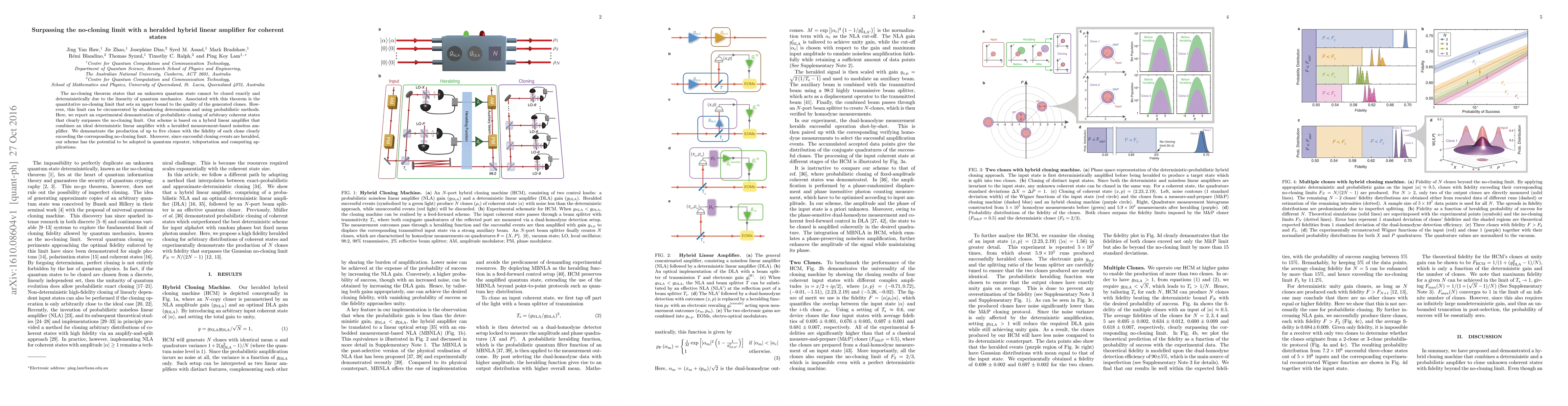 This paper demonstrates a method for probabilistically cloning arbitrary coherent states, surpassing the classical no-cloning limit, using a hybrid linear amplifier that combines deterministic and heralded noiseless amplification. The fidelity of up to five clones exceeds the no-cloning limit, with successful cloning events heralded, indicating potential applications in quantum communication and computing.