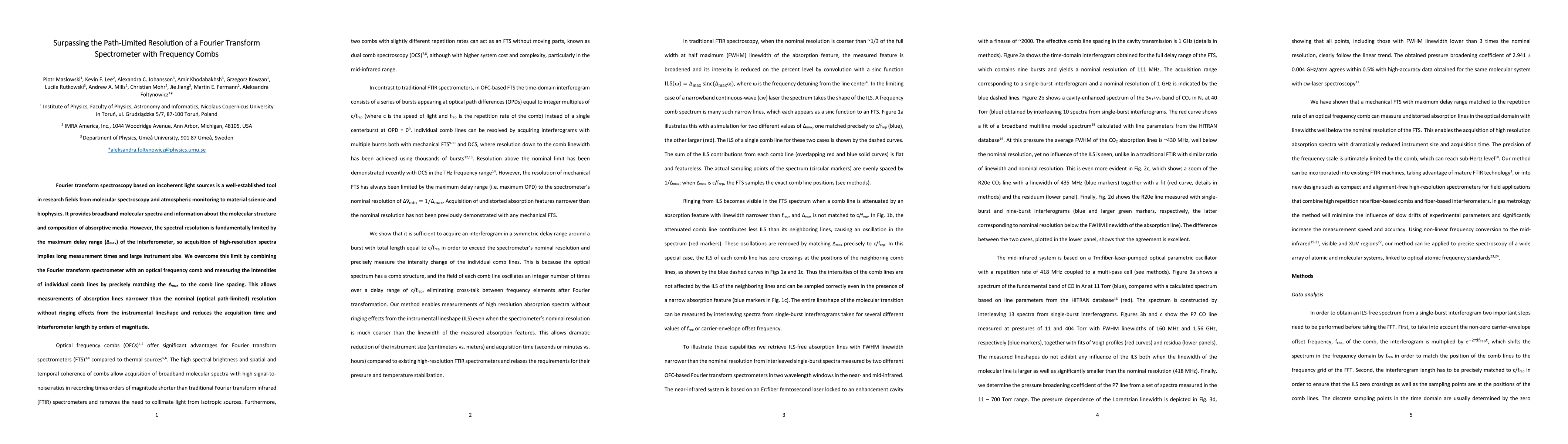 This paper proposes a method to surpass the path-limited resolution of Fourier transform spectrometers by integrating optical frequency combs, allowing for high-resolution spectra without the usual long measurement times and large instrument sizes. This approach measures individual comb lines to achieve narrower absorption lines and significantly reduces acquisition time and interferometer length.